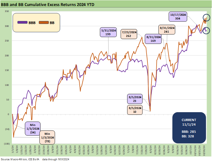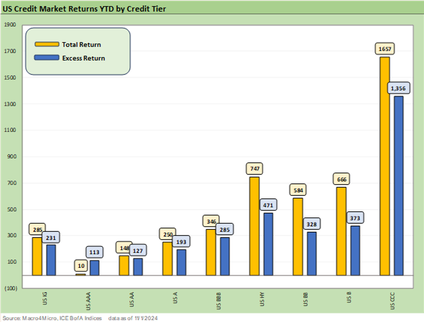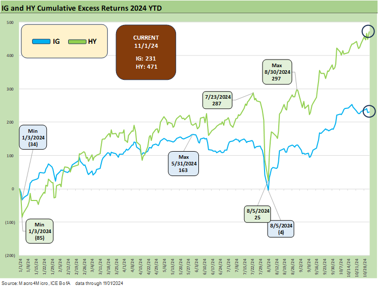 The above chart updates the running YTD total returns and excess returns for IG and HY and for the ratings tiers. The pattern is rational for excess returns and in line with relative risk in the context of US economic trends and industry fundamentals. What we all wrestle with now is how to readjust expectations for forward-looking risk when the smoke clears (we hope not literally) on the White House, Senate, and House lineup.