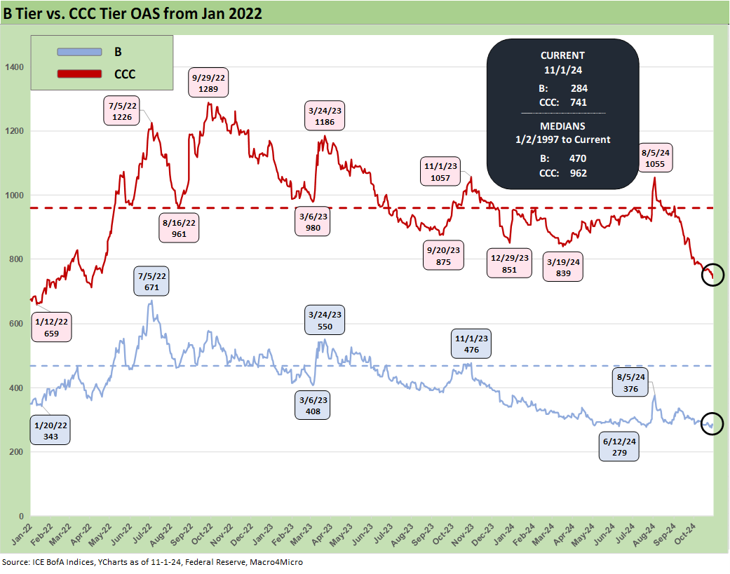 For this past week, the B tier tightened by -1 bp to +284 bps. The B tier OAS has been the bigger story of this credit pricing cycle in what traditionally has been the sweet spot of the HY market back to the old days of the 1980s. Running through the +300 bps line was not seen in the lows of Dec 2021 or during the low ticks of Jan 2020, Oct 2018, or June 2014 as noted in the chart. True to form, early June 2007 was heading closer to the +200 bps line at a low of +236 bps in a bubble for the ages. The June 1997 lows hit +292 bps.