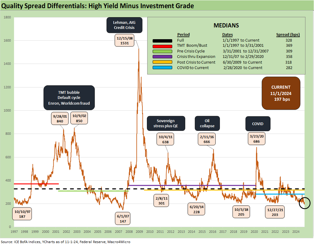 The above chart plots the “HY OAS minus IG OAS” quality spread differential. We looked at this in the earlier Mini Market Lookback posted over the weekend, and it tightened by -7 bps with a move through the +200 bps line to +197 bps from last week’s +204 bps (see Mini Market Lookback: Showtime 11-3-24).