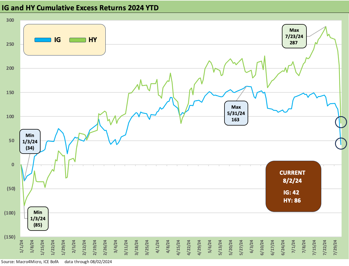 The above chart updates the running YTD excess returns for IG vs. HY through Friday as the peak credit returns through late July gave way to a dramatic plunge last week. We note the running highs for each HY and IG with the dates and returns noted.