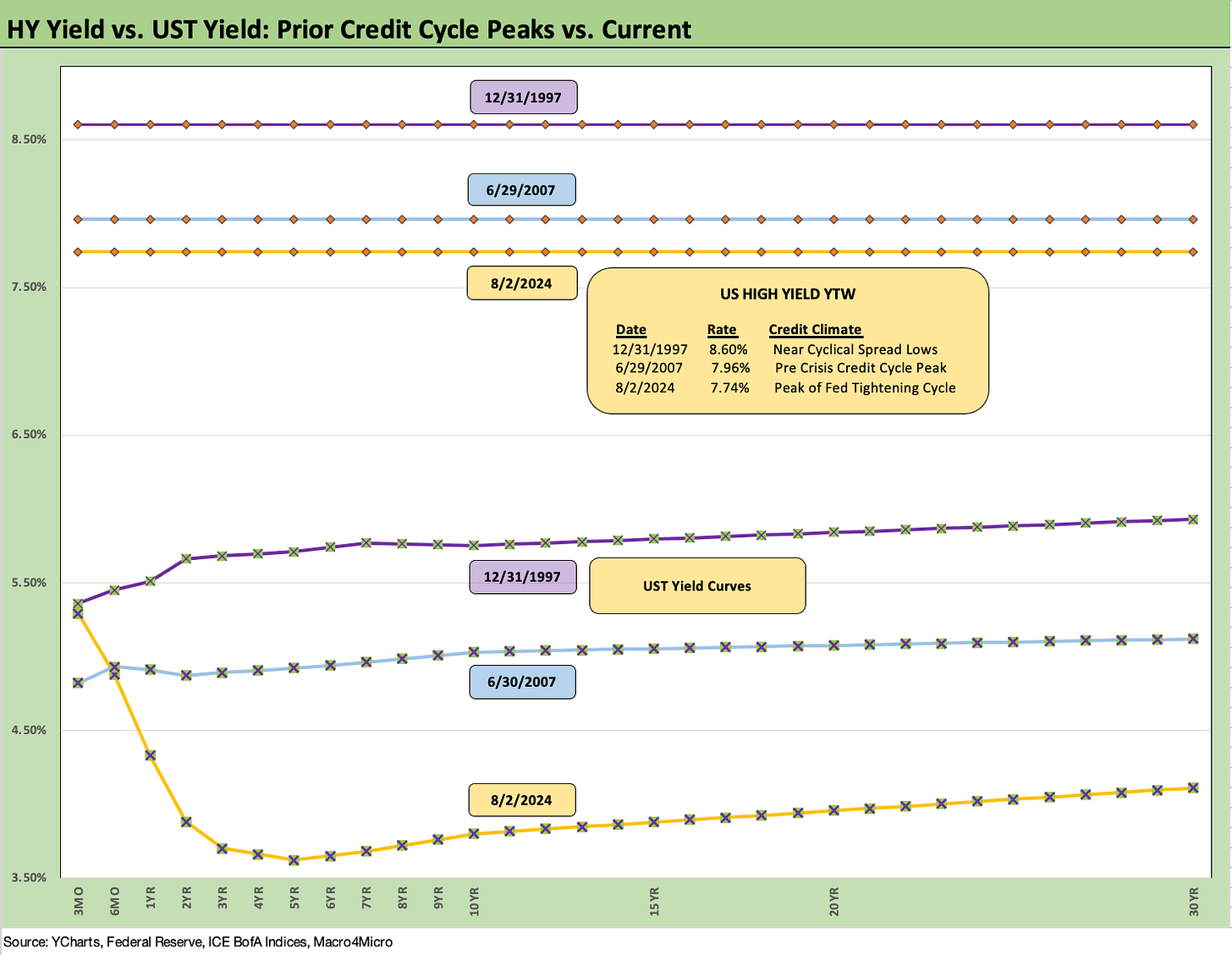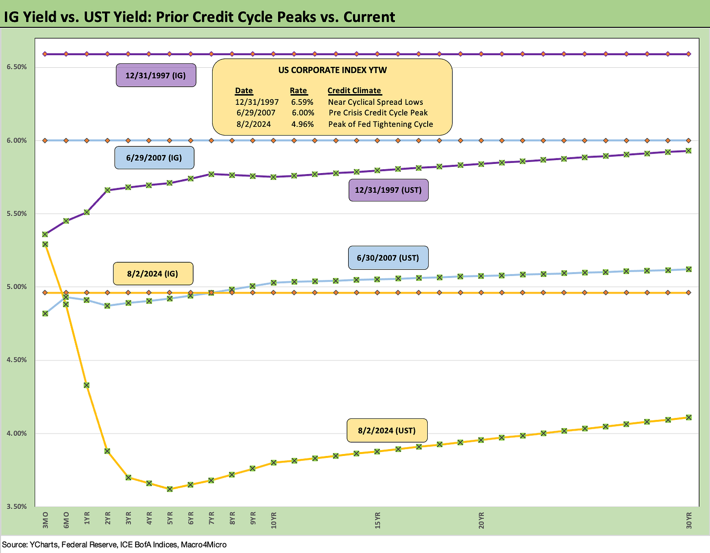 The above chart is something we use for historical context as we compare current IG index yields to prior credit market peaks in late 1997 and mid-2007. We also detail the UST curves in those earlier peak periods.