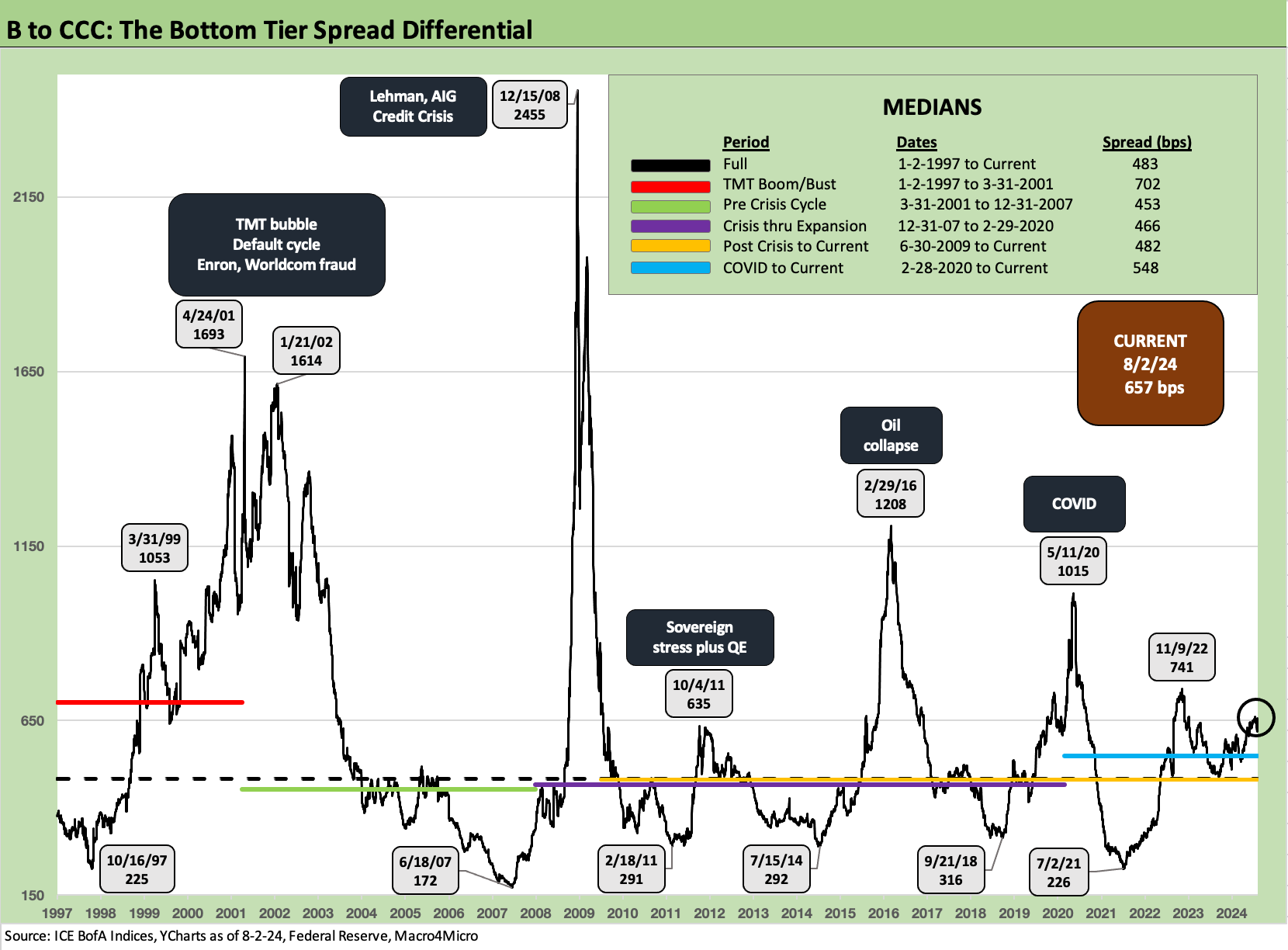 CCC is all about the single name selection and less about credit tier aggregate OAS for the mix. As a collection of names at this point, the quality spread differential is well above the long-term median and all the median timelines in the chart except the late TMT cycle median of 1997 to 2001, which was an especially awful underwriting cycle.