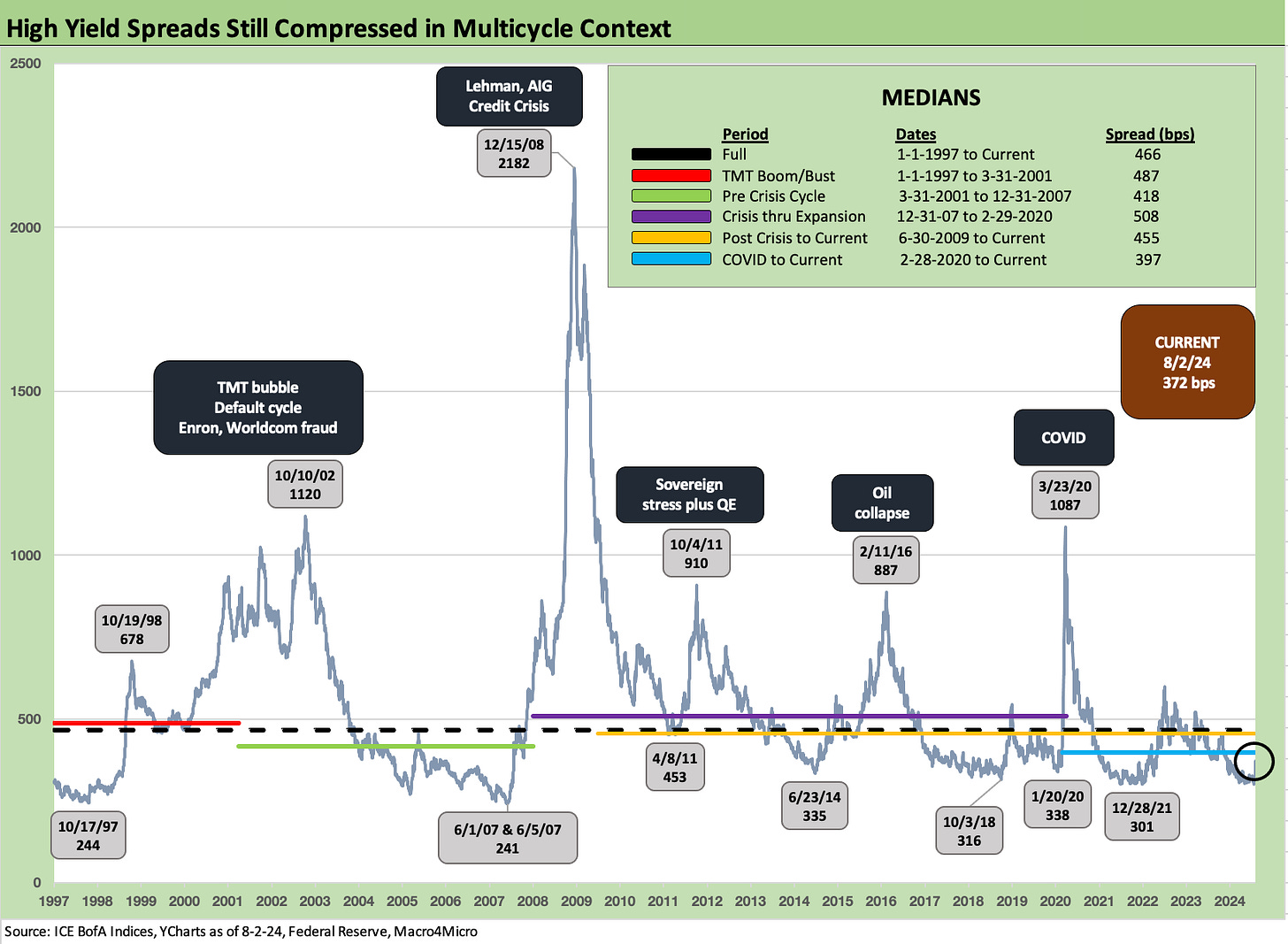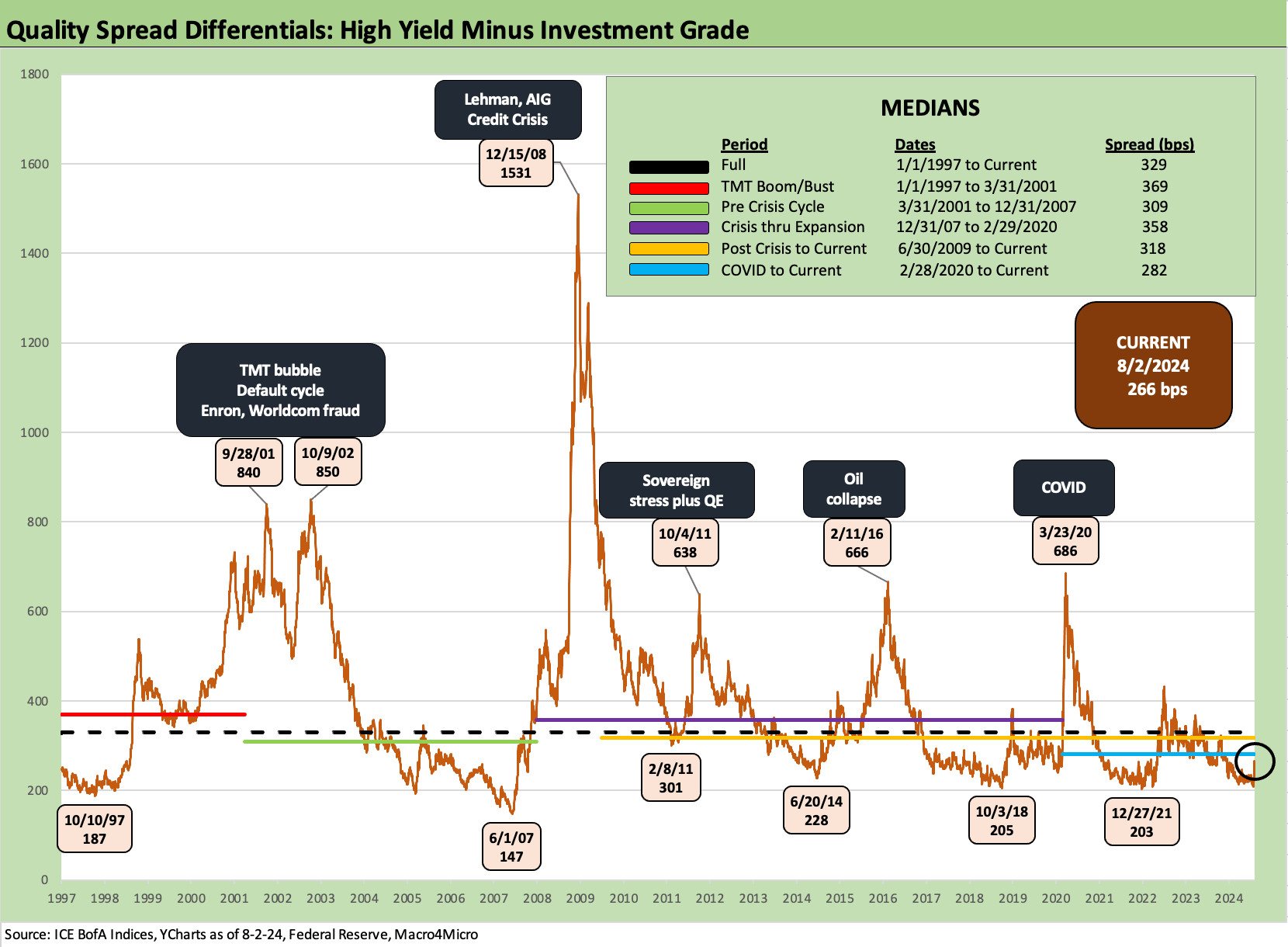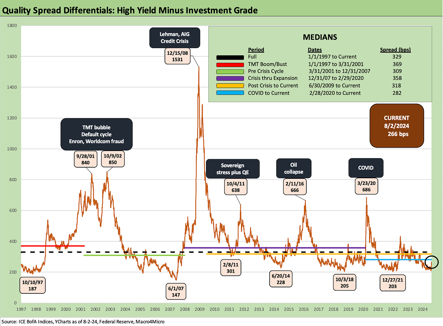 The +266 bps is still well inside the long-term median of +329 bps. The narrowest timeline median for this differential as broken out in the chart from prior cycles was +309 bps in the period from 2001 to 2007. That was a market with 1% fed funds on the way into 2004 and a structured credit binge underway. The current post-COVID cycle has shown the narrowest median at +282 bps as of the end of this past week.