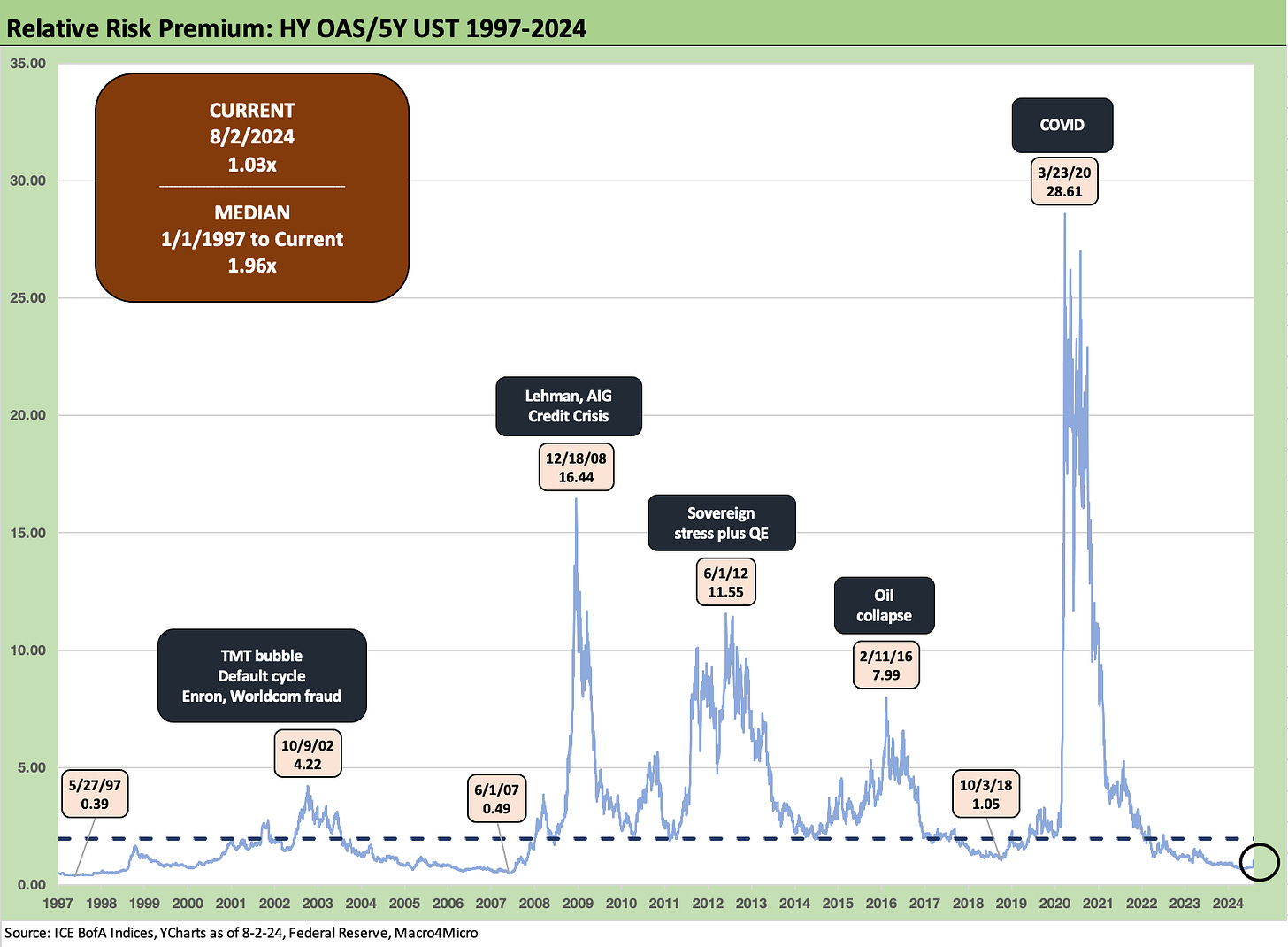 The above chart does the same drill for the HY bond index as we did for IG bonds. The same distorted relationship exists for the current UST curve on an inversion that as of this week will likely be seen as unsustainable. We had summarized all the relevant cyclical story lines for these periods in an earlier commentary (see HY Spreads: Celebrating Tumultuous Times at a Credit Peak 6-13-24).