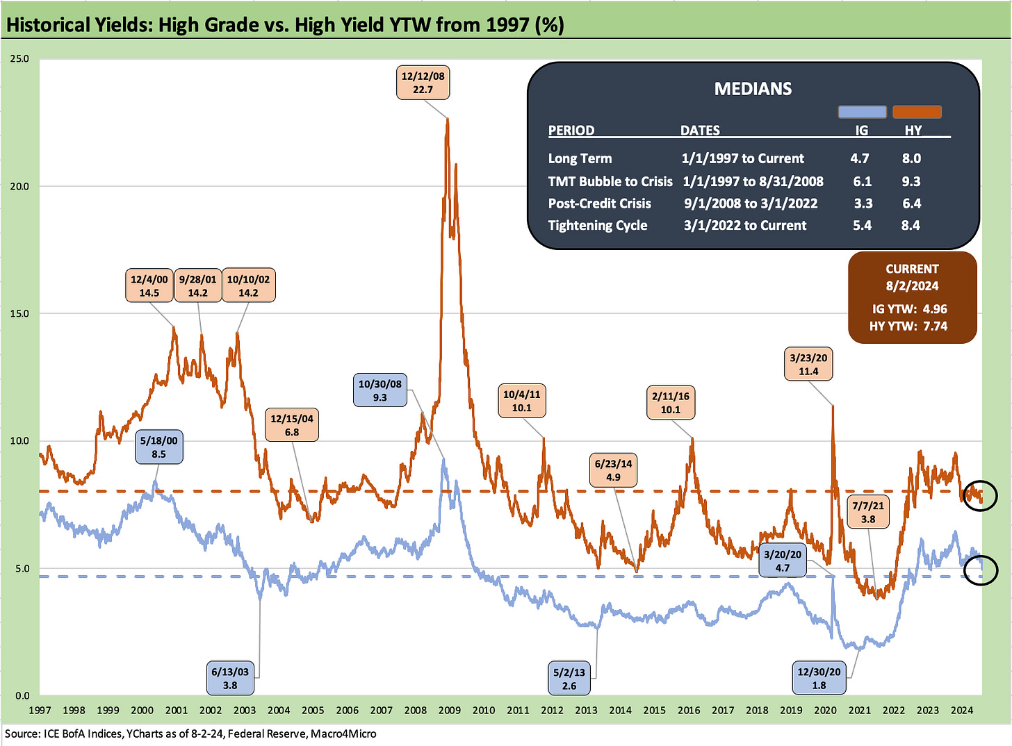 The above chart updates the running YTW for the IG and HY indexes across time. We use it to highlight what we see as the most relevant median, which is the YTW from outside the ZIRP years and post-ZIRP normalization period. In this case, these are the pre-crisis medians of 6.1% for IG and +9.3% for HY.