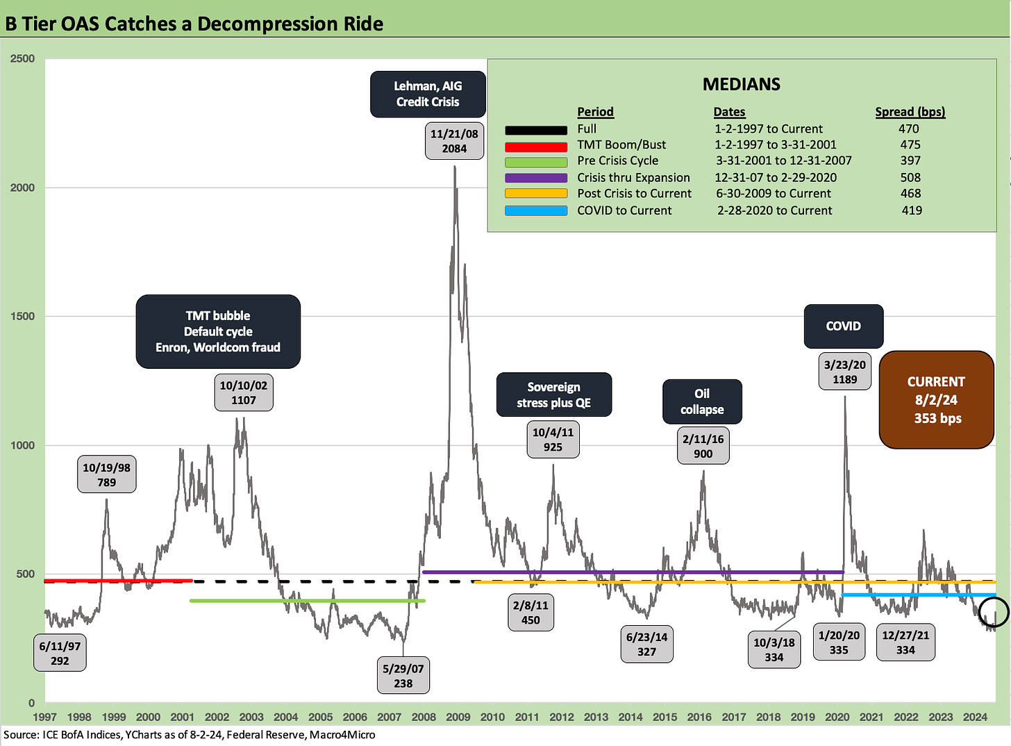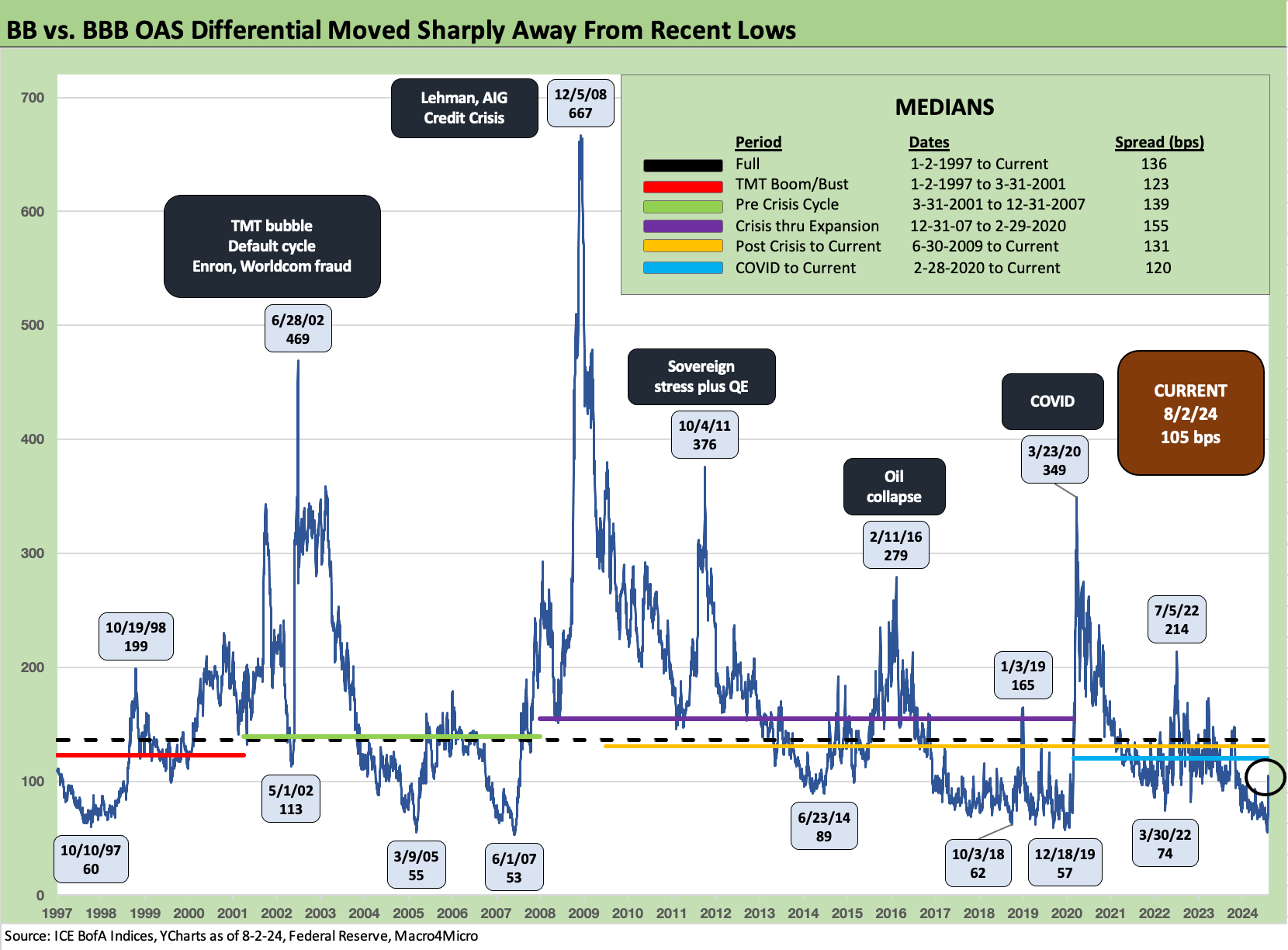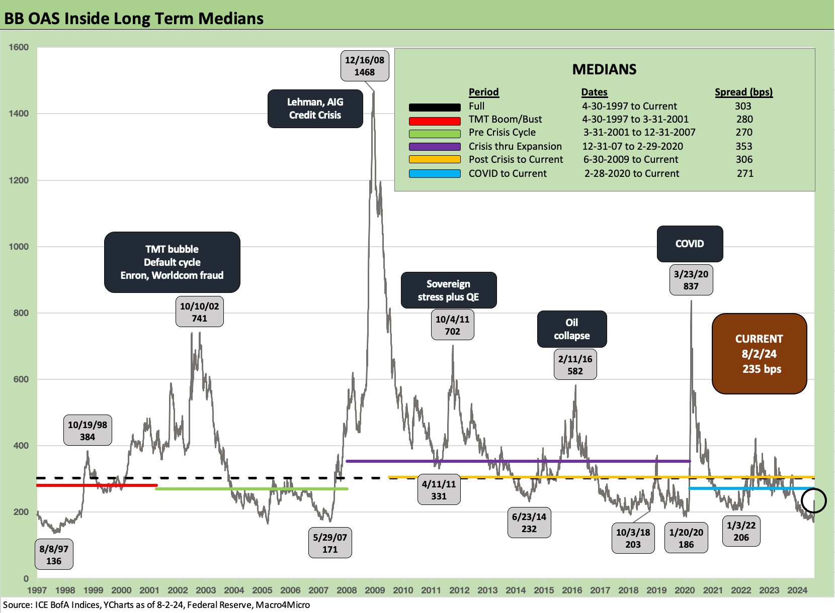 BB OAS moved +58 bps wider to +235 bps after being down at a pricey +177 bps the prior week. That was a major move, but the +235 is still comfortably inside the long-term median of +303 bps and all the subset medians detailed in the box within the chart.