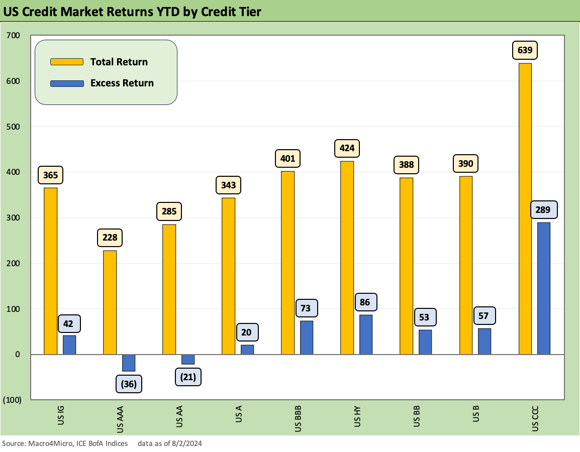 The above chart details the YTD total returns and excess returns across the credit tiers as HY is still winning vs IG on spread compression (for now…on a YTD basis) and higher coupons plus the new return contributions of the UST. The YTD UST deltas are finally positive again as covered in our Footnotes publication on yields (see Footnotes & Flashbacks: State of Yields 8-4-24).