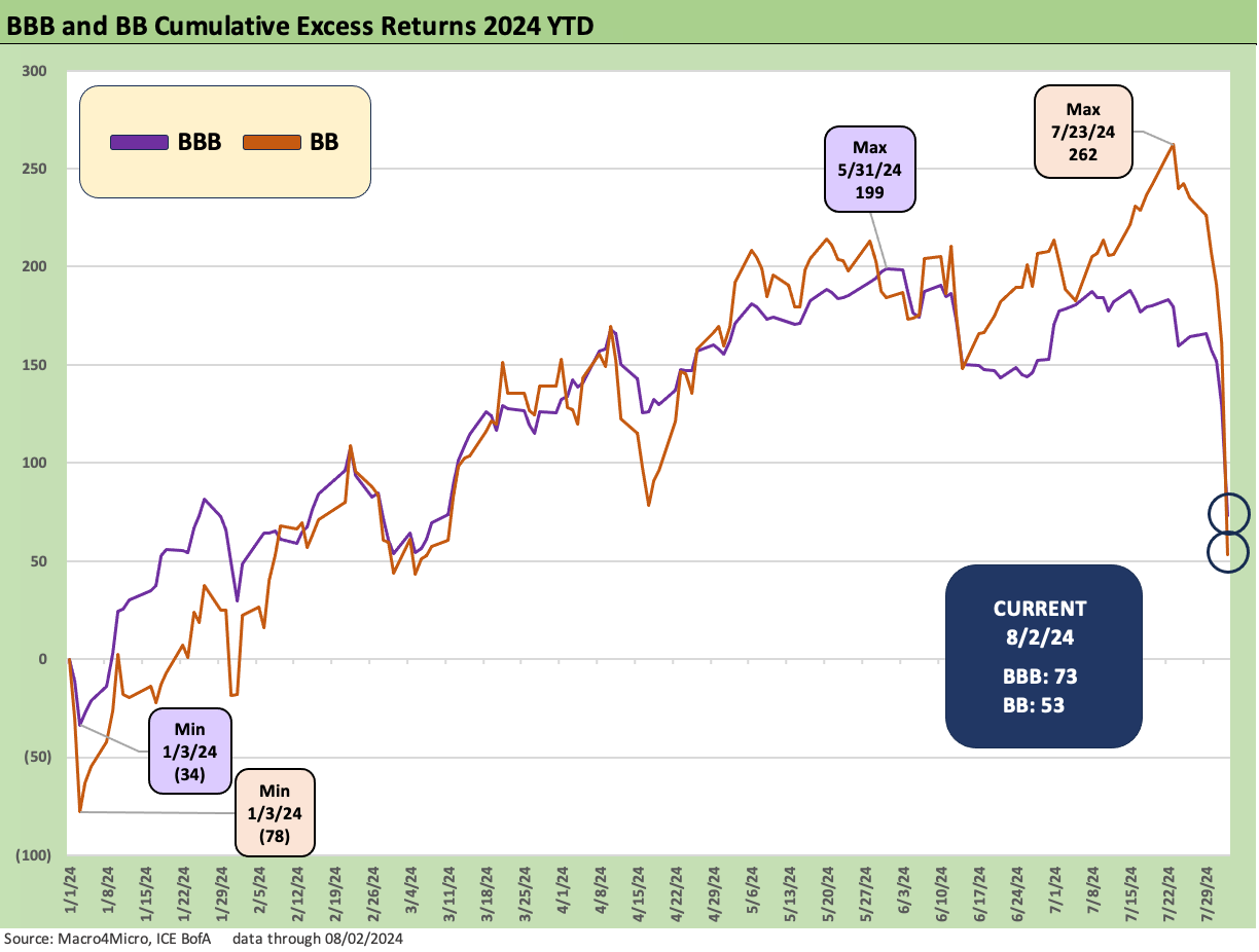 HY OAS trends took a beating last week with a +62 bps widening to +372 bps from +310 bps. As noted in the OAS lows in the time series above, that +310 bps last week was close to the Dec 2021 low of +301 bps and inside the +316 bps low of early Oct 2018. We looked at the prior 2018 period in a comment this weekend as a useful historical lookback in what can go wrong when a late cycle case of nerves breaks out (see HY Pain: A 2018 Lookback to Ponder 8-3-24).