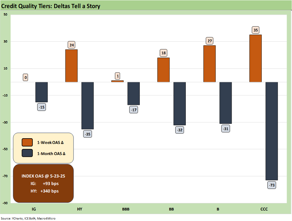 HY and IG spreads diverged the past week, with HY widening +24 bps with quality spread widening down the quality curve, but IG remained flat.
