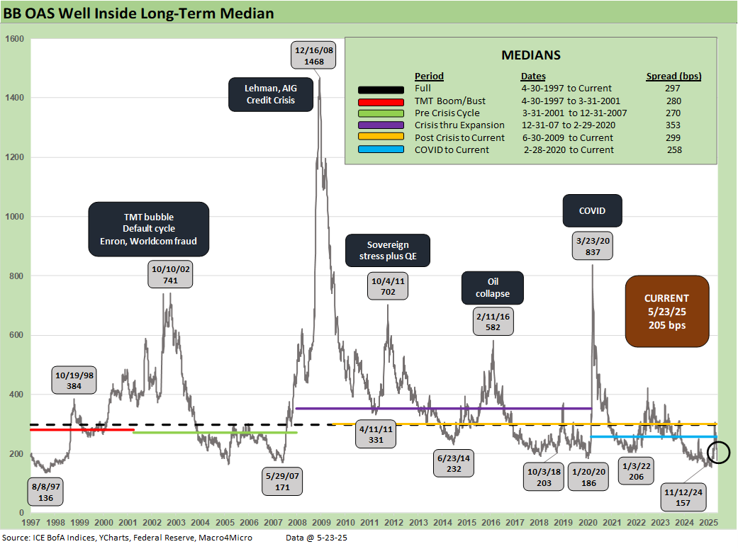 IG spreads ended the week flat and still in double-digit territory at +93 bps, remaining near prior cycle lows as the US IG market has reacted less to the erratic trade policy news flow. Spreads overall remain comfortably below the longer-term medians, but this is an IG OAS level that will be a challenge to sustain as we look back across time with stagflation risk heightened.