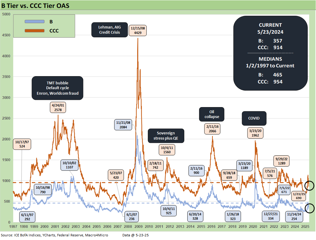 The B vs. CCC tier OAS time series is plotted above. The timeline for B and CCC spreads highlights the points of major divergence along the way (see The B vs. CCC Battle: Tough Neighborhood, Rough Players 7-7-24).