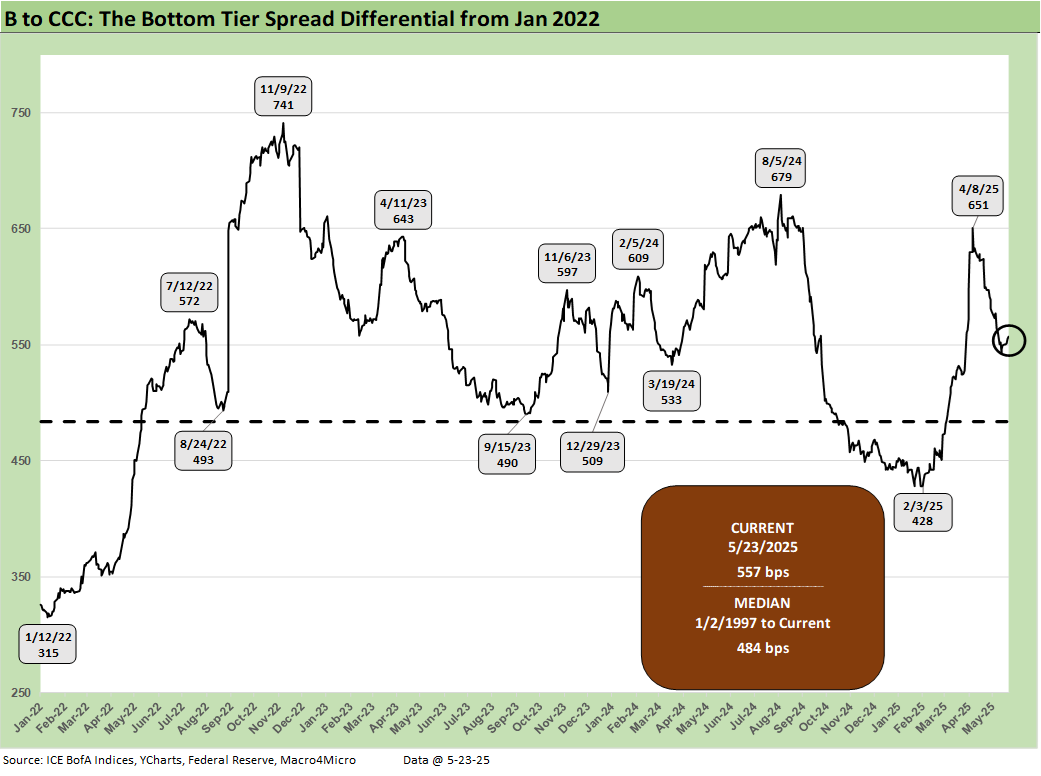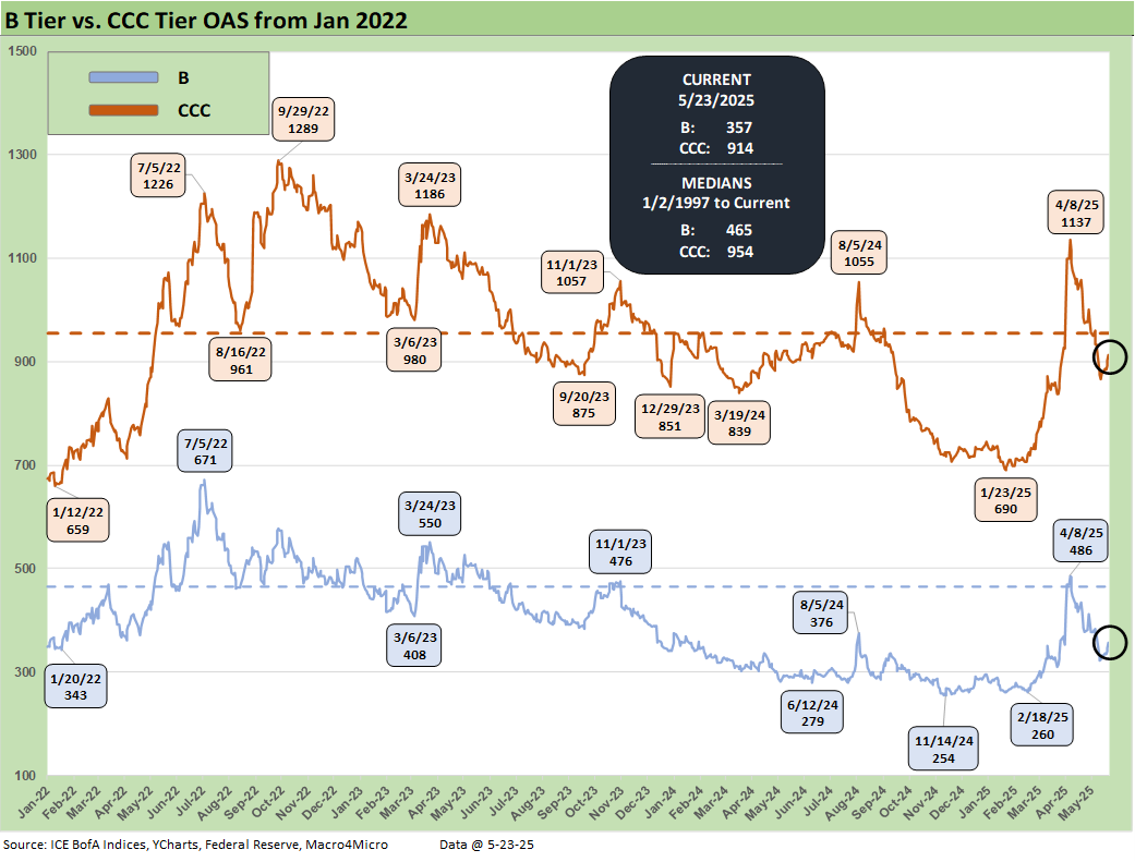 The current CCC tier OAS at +914 bps widened by +35 bps the past week though remained under the long-term median of +954 bps. The recent volatility was a brief reminder of the kind of B vs. CCC divergence that can happen in a hurry as markets reprice. Further tariff chaos still has the potential to repeat that volatility with recent US-China truce and EU tariffs flashpoints that are avoided for now.