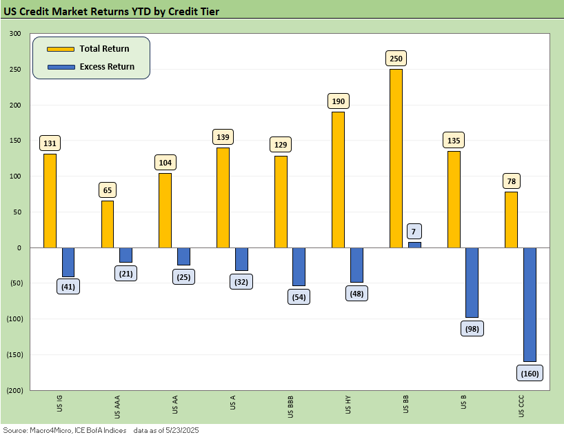 The above chart shows total and excess returns for the year across IG, HY, and the ratings tiers. Excess returns are hovering in the negative with the exception of BBs after a volatile start to the year but the total return picture is still positive given the UST rally from 2Y to 10Y in 2025. Annualizing those returns is depressing even for the positive total returns. There is “a lot of year left” along with no shortages of tariff and US budget uncertainty. Global turmoil can also rear up as we got a taste of this week with Japan long bonds.