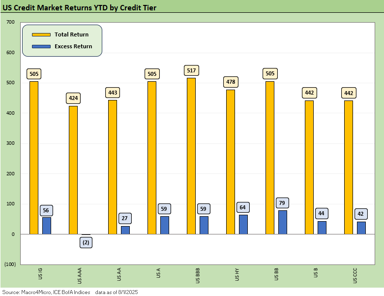 Total returns show the benefits of the modest bull steepener that has supported the short to intermediate UST curve segment (see Footnotes & Flashbacks: State of Yields 8-3-25). That duration angle can support the trade-off along the BBB/BB divide for the now well-established HY Light strategy.