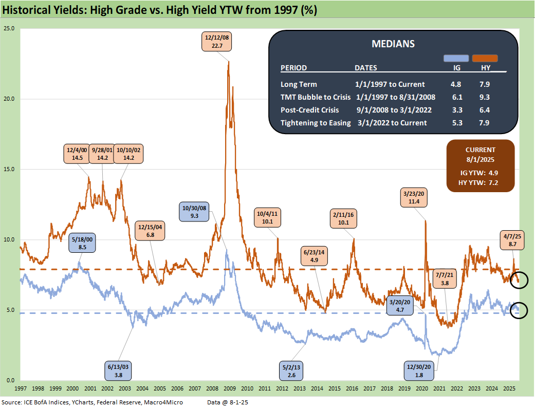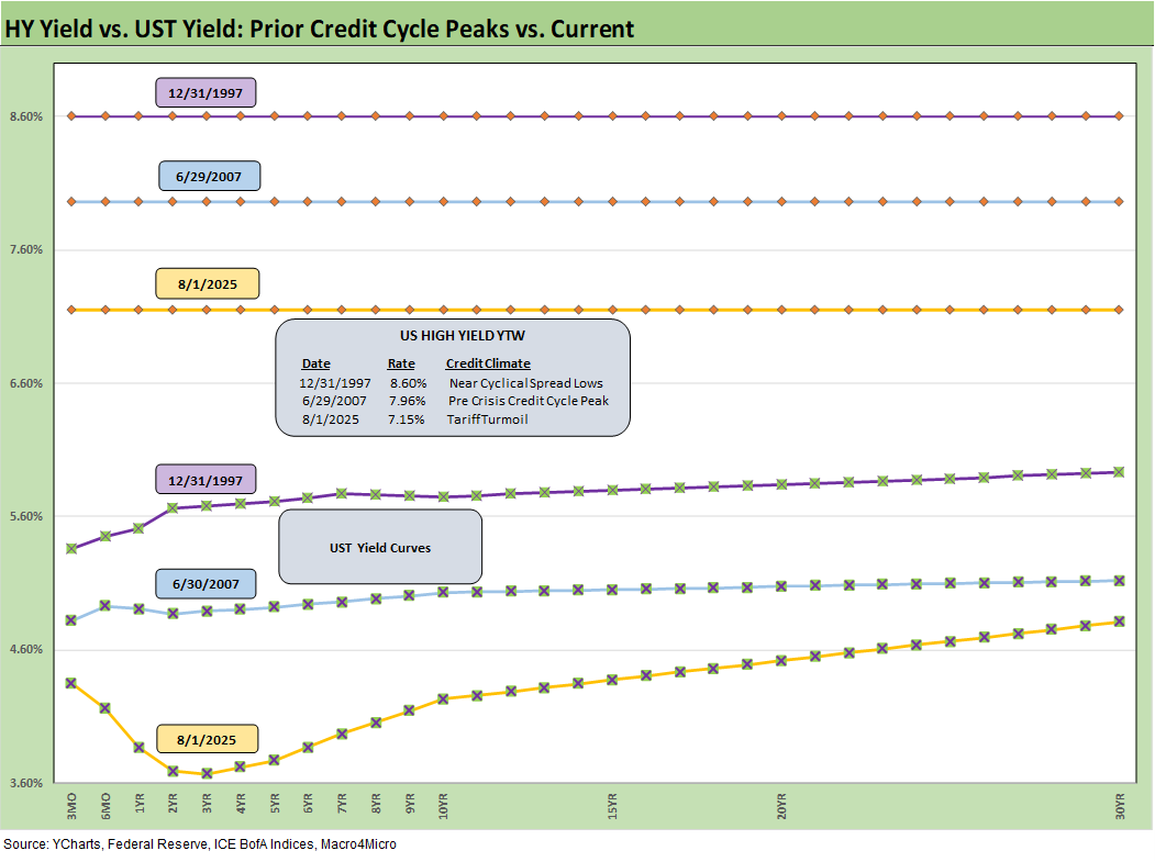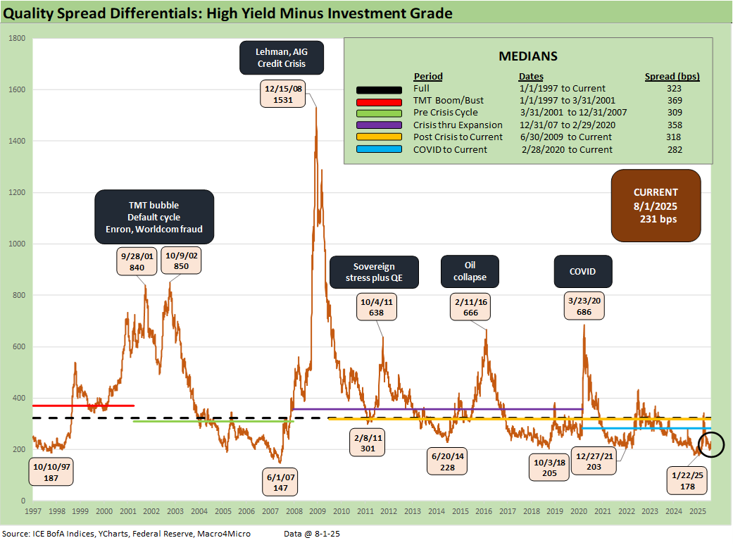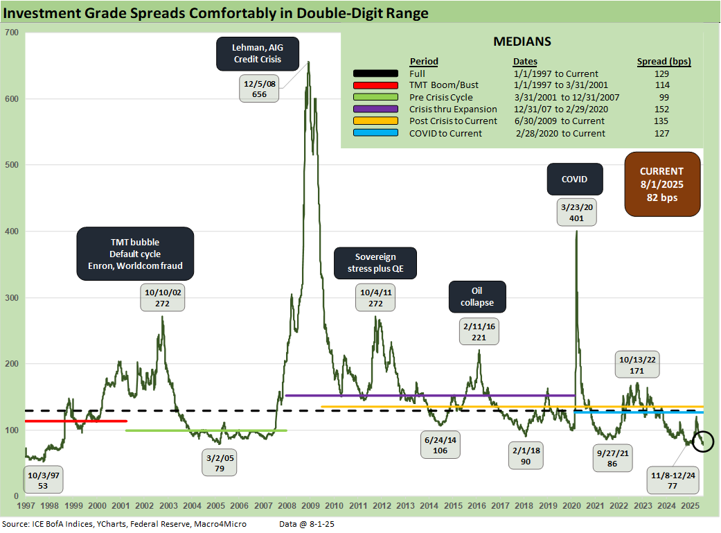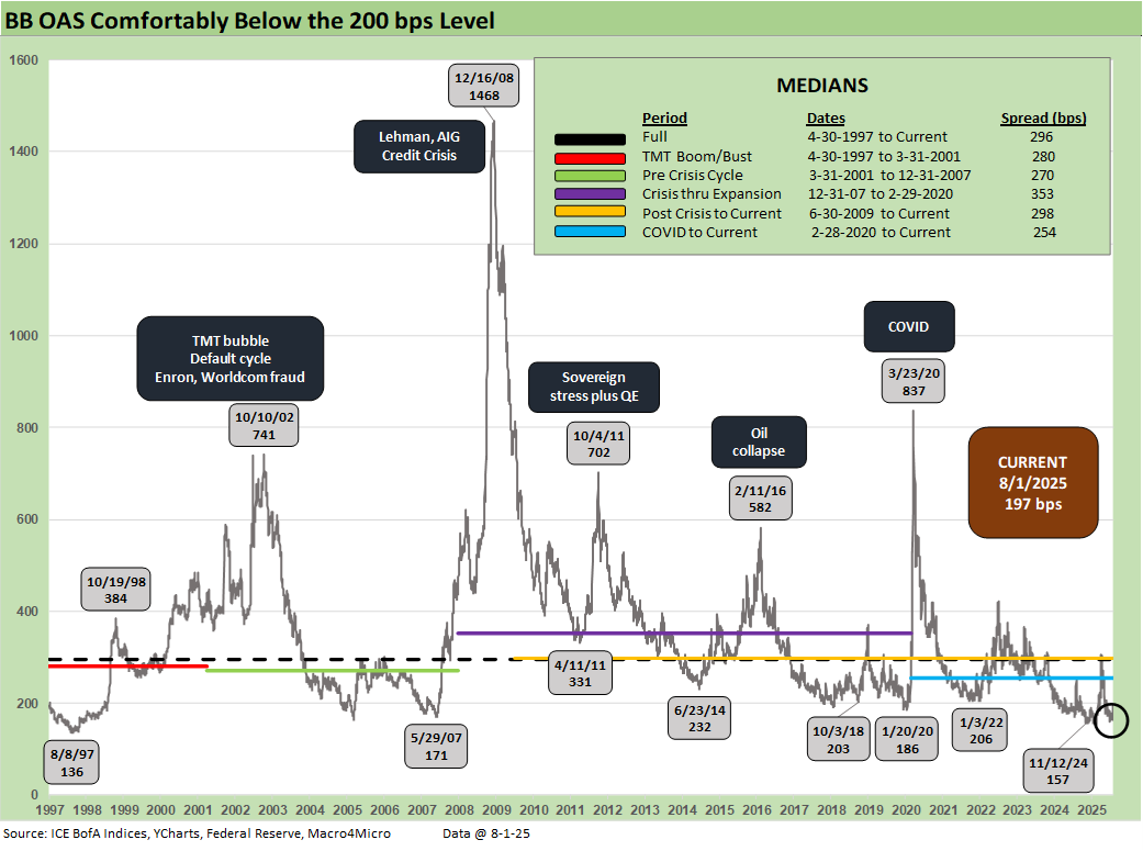 Material revisions to prior payroll data revealed the weakest three-month job growth stretch since COVID. GDP data also came in soft, particularly in consumer spending and fixed investment, while inflation pressures appear to be emerging in select categories. Even with the late week backup, HY remains near historically tight levels near 2018 lows. The January 2025 trough of +259 bps is still anchoring the market’s valuation lens that reminds us more of the June 2007 bubble (see Employment July 2025: Negative Revisions Make a Statement 8-1-25 , 2Q25 GDP: First Cut of Another Distorted Quarter 7-30-25).