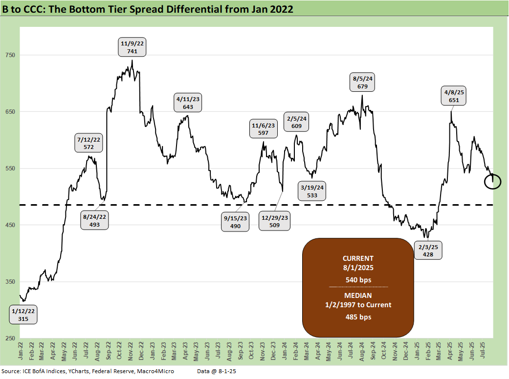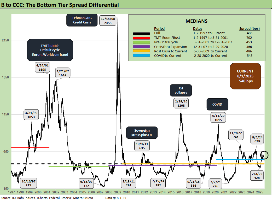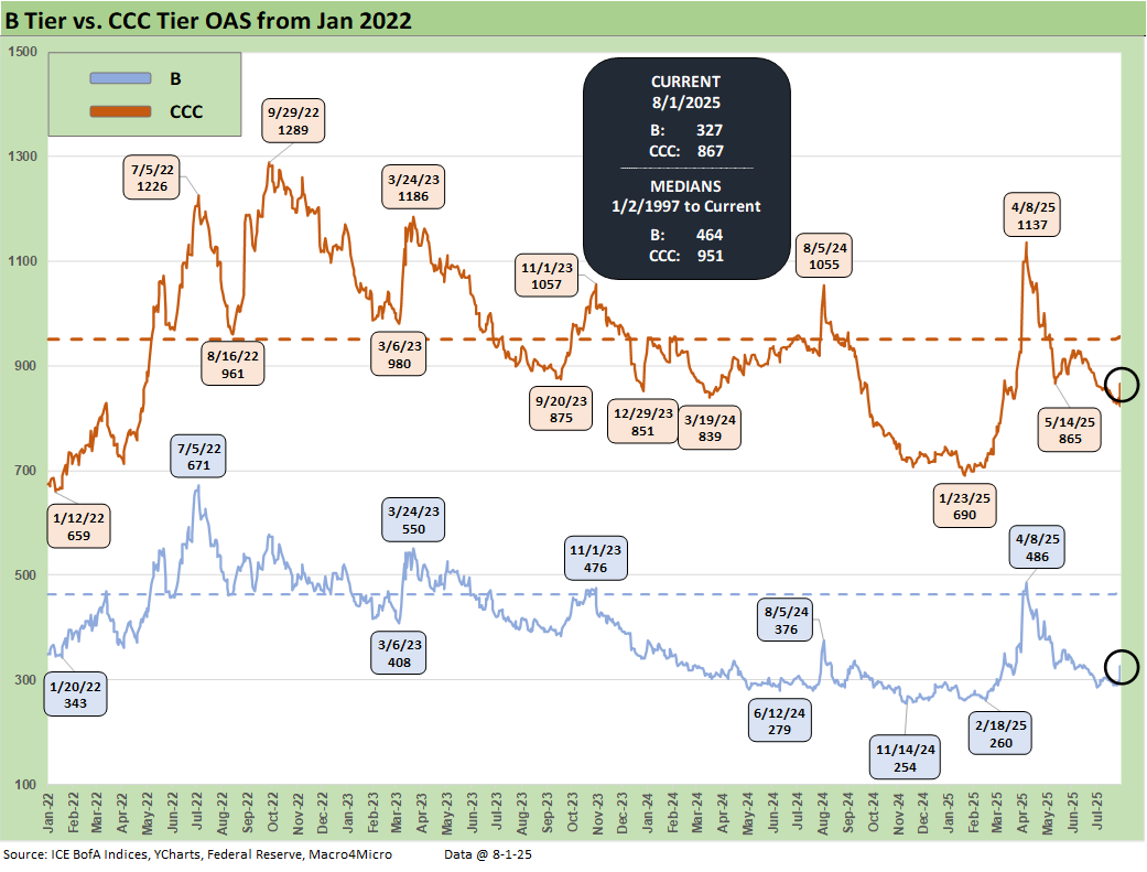 The B vs. CCC tier OAS time series is plotted above. The timeline for B and CCC spreads highlights the points of major divergence along the way (see The B vs. CCC Battle: Tough Neighborhood, Rough Players 7-7-24).