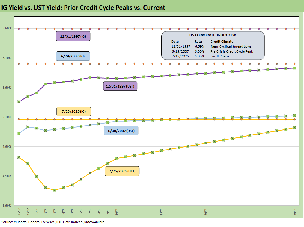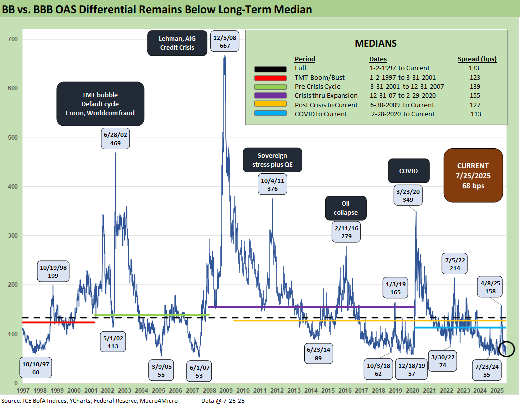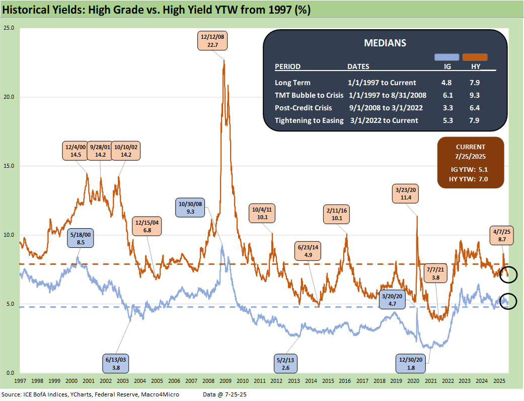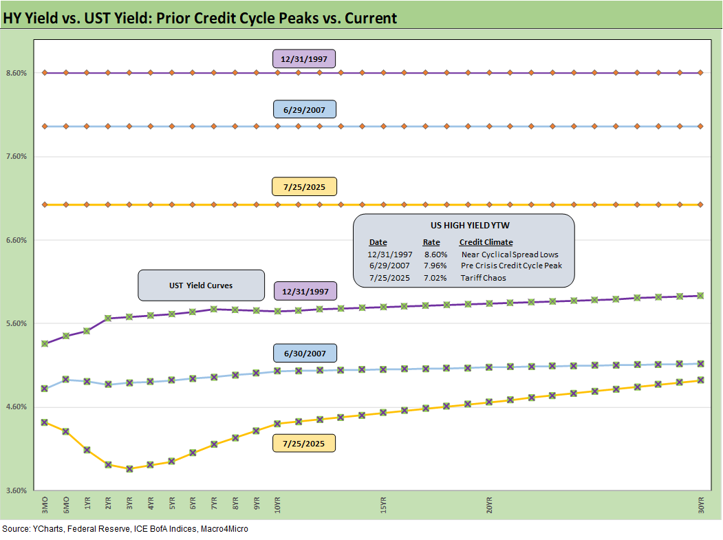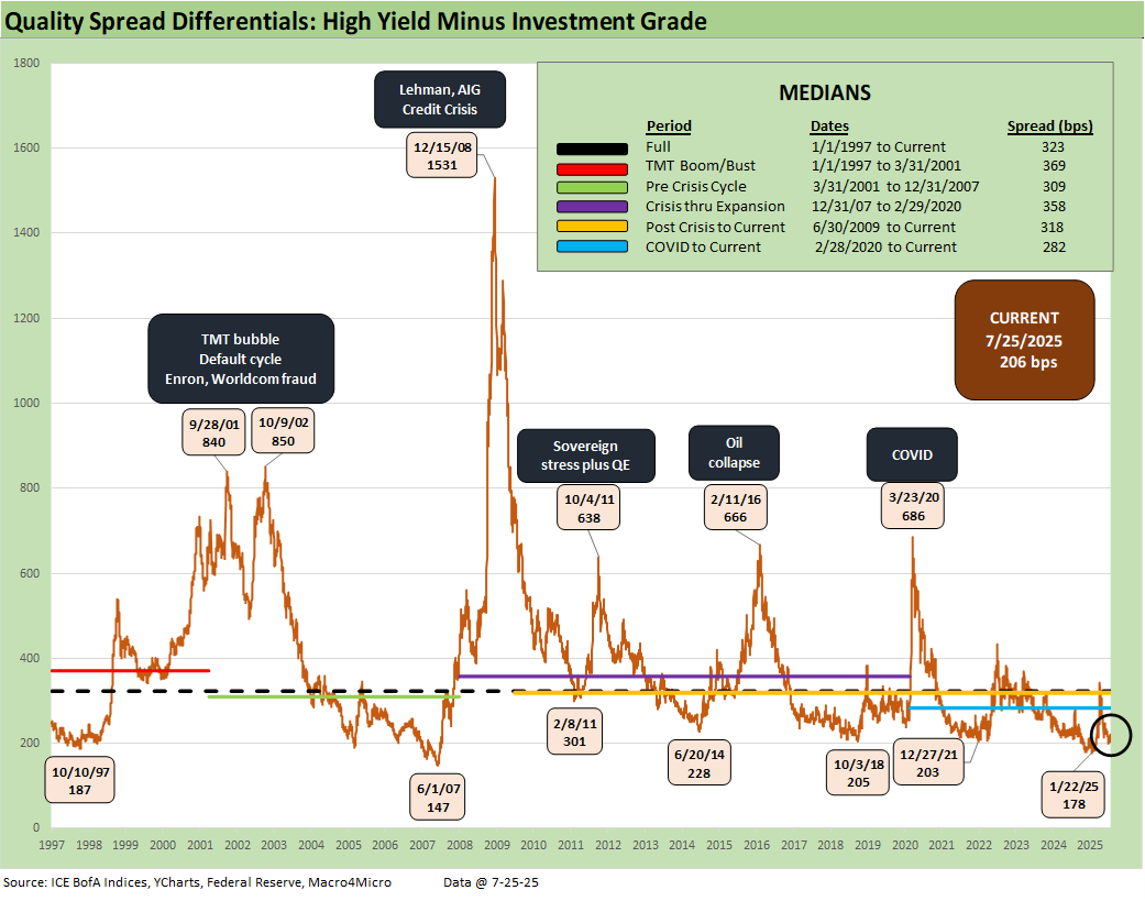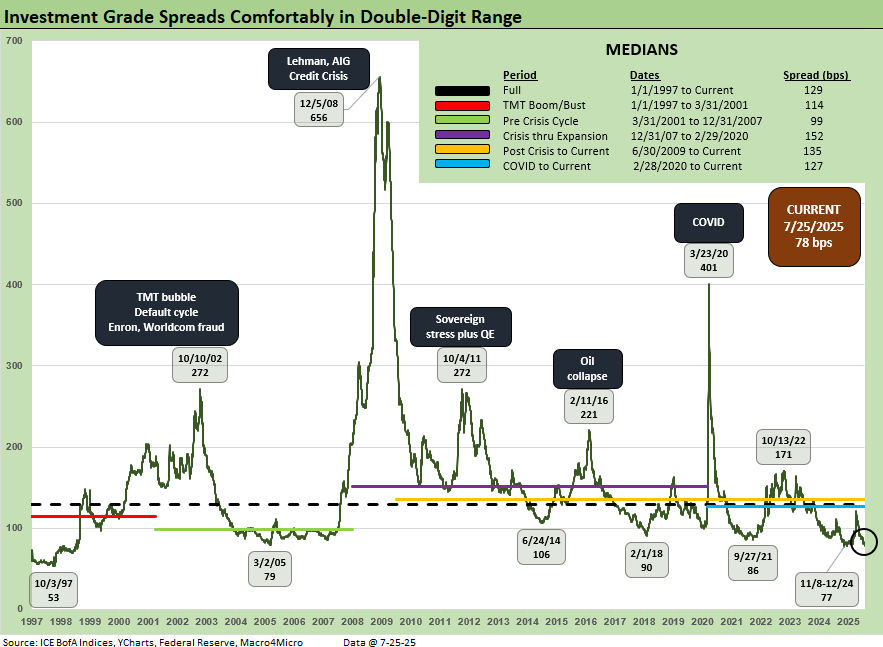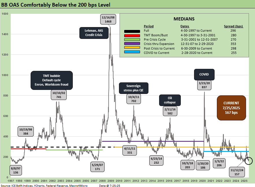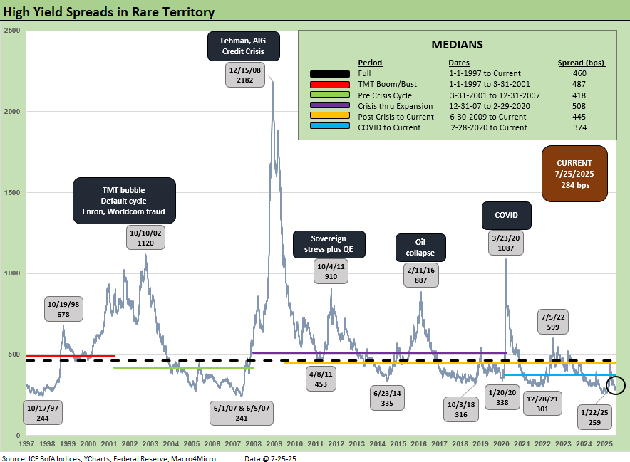 HY spreads tightened -9 bps to +284 bps, and HY OAS is now in a very rare territory with a 200-handle that is more in line with the June 2007 and recent 1Q25 lows. We saw a long stretch of 200-handle HY spreads back in the 1997 credit cycle peak as well. These levels are inside the pre-COVID Jan 2020 levels and the prior cyclical lows of Oct 2018 and Jun 2014. The recent 2024 lows of +260 bps and +259 bps in Jan 2025 mean the uber-bulls will stay in the game, but even with tariffs moving to the 15-20% range (and higher), there are still hurdles coming after Aug. 1st.