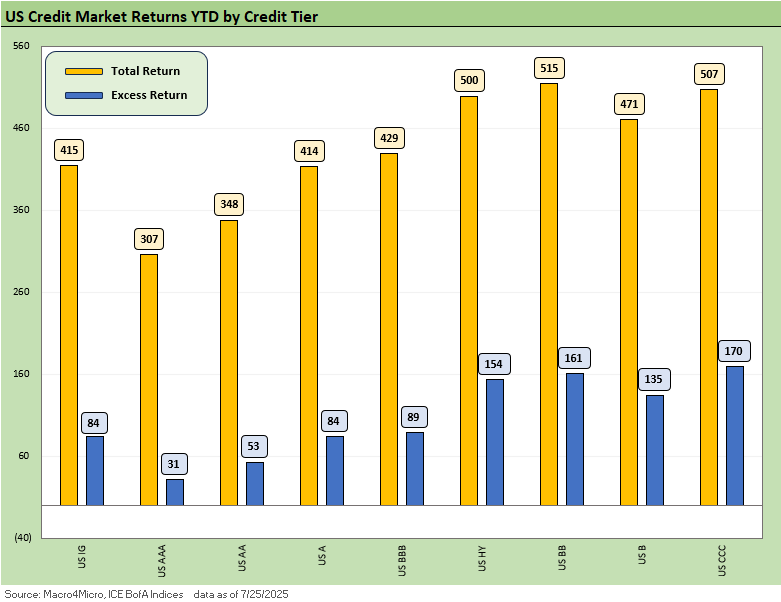 Total returns show the benefits of the modest bull steepener that has supported the short to intermediate UST curve segment (see Footnotes & Flashbacks: State of Yields 7-27-25). That duration angle can support the trade-off along the BBB/BB divide for the now well-established HY Light strategy.