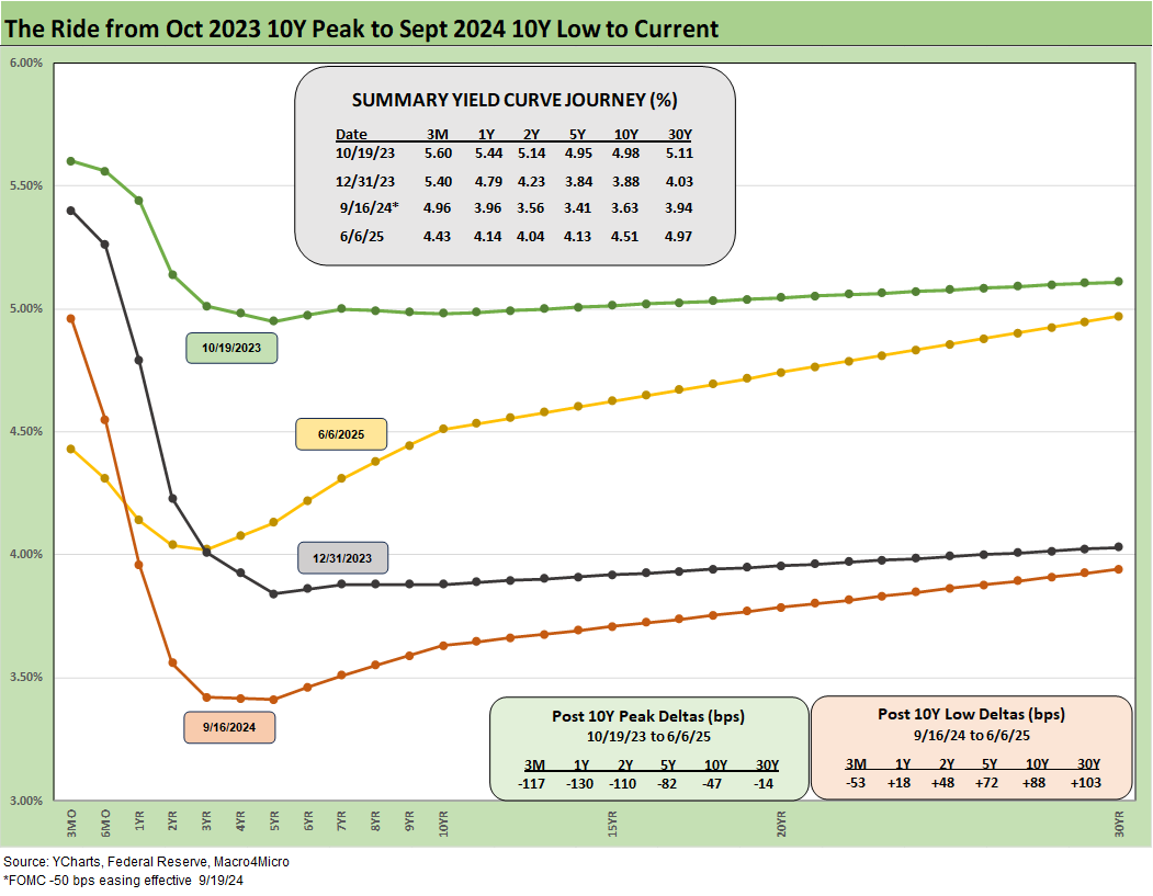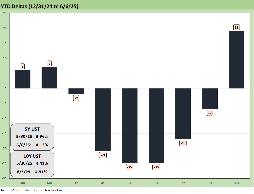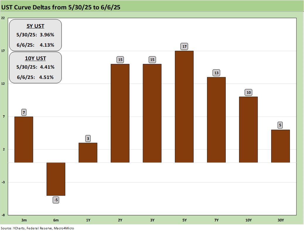The above breaks out the weekly UST deltas that we already looked at in Mini Market Lookback: Clash of the Titans (6-7-25). The UST curve pushed higher on the week on good economic news with JOLTS and the Payroll numbers both constructive (Payrolls May 2025: Into the Weeds 6-6-25, Employment May 2025: We’re Not There Yet 6-6-25, JOLTS April 2025: Slow Burn or Steady State? 6-3-25).