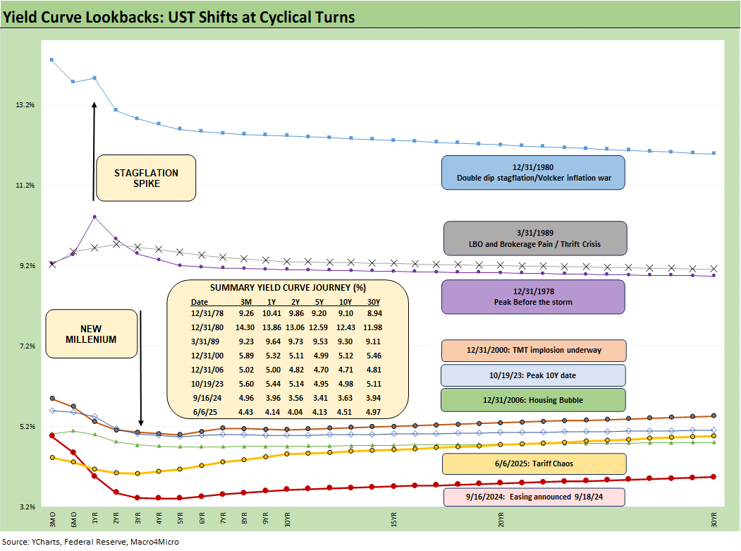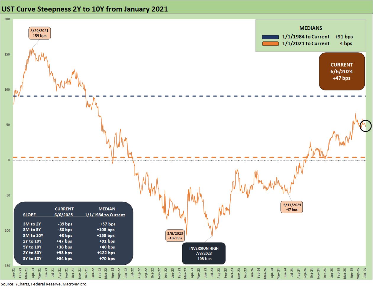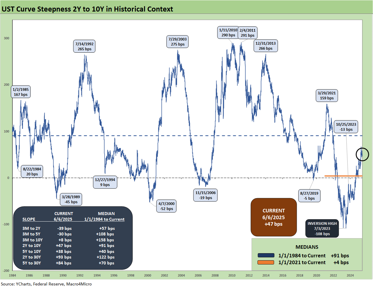 The shift higher from Sept 2024 lows and the steepening from the low point at the end of 2023 is in the chart. We see the 10Y and 30Y notably higher with a more normal shape from 2Y out to 30Y. The challenge is still that front end inversion from 3M. This week we look at the 2Y to 10Y UST slope history further below. The inversion anomaly during a protracted expansion has been hard to shake with the FOMC holding the line over tariff-related inflation questions.