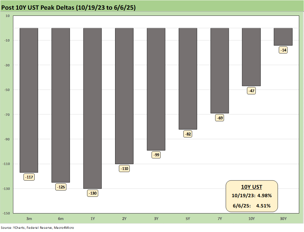 As noted in the chart above, we use the Oct 2023 UST peak date on the 10Y UST as a key frame of reference. The UST rates now are very low by any historical standard but well above the Sept 2024 lows as we lifted off from the initial easing into another steepener in 2025.