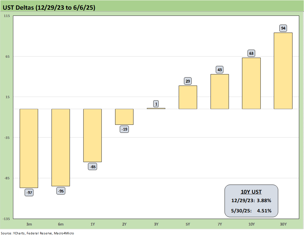 The above chart updates the UST deltas from the end of 2023 after a massive rally in rates and risk in Nov-Dec 2023. The follow-on in 2024 expected by the consensus mildly disappointed the UST bulls in the number of FOMC cuts (the market got 4 x 25 but not the number of 5 to 6 FOMC 25 bps cuts expected). The expectation of a pronounced bull flattening during 2024 also did not play out as expected when a bear steepener prevailed by the end of the year.