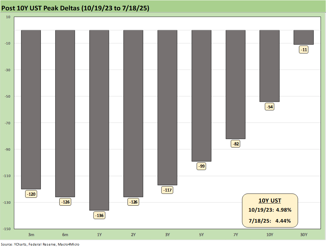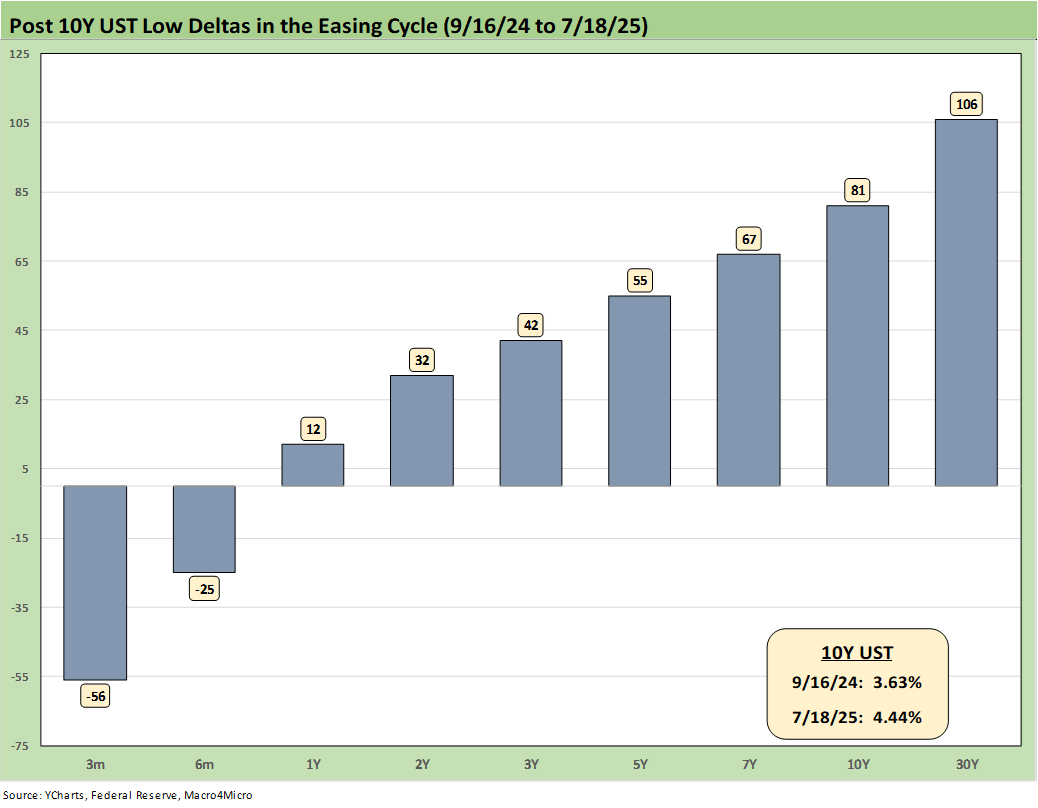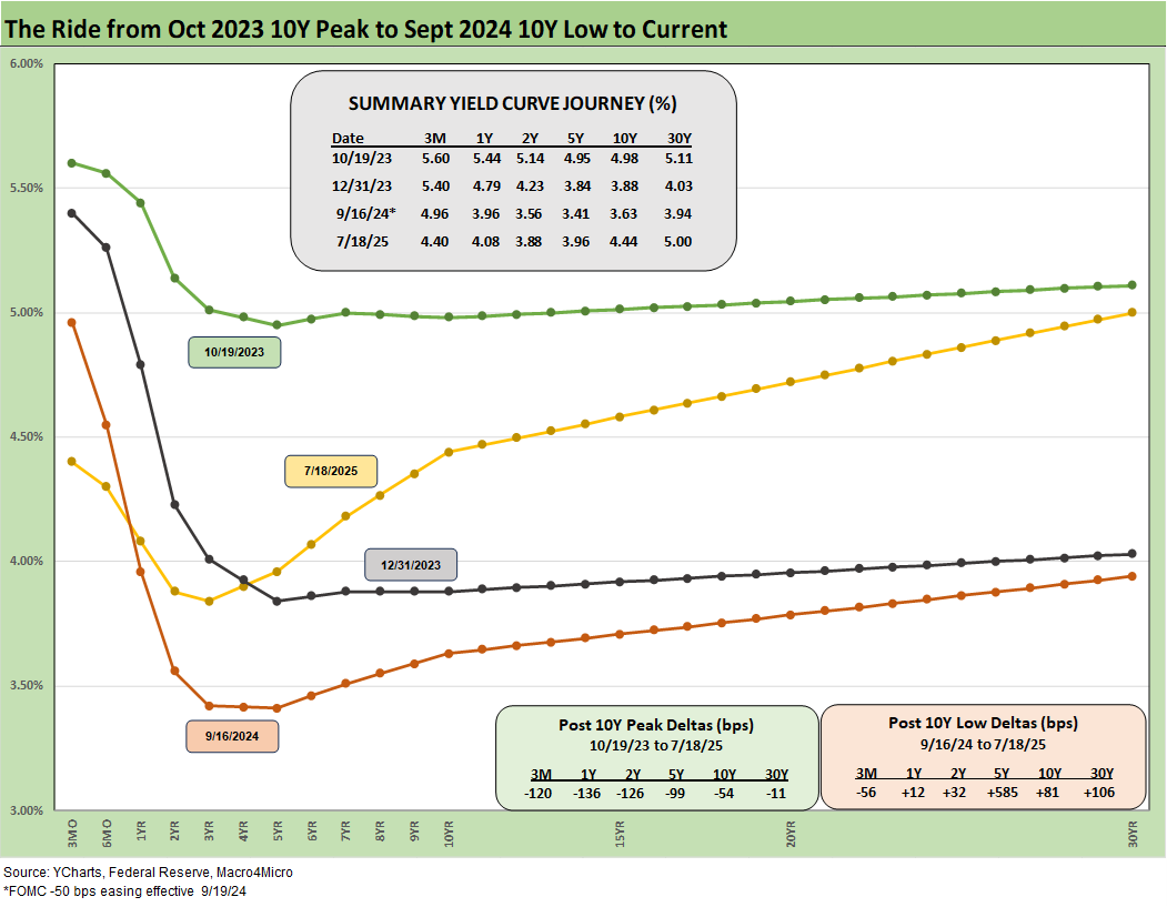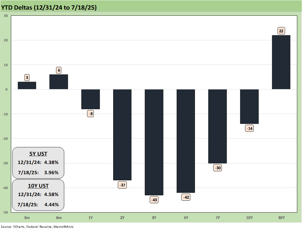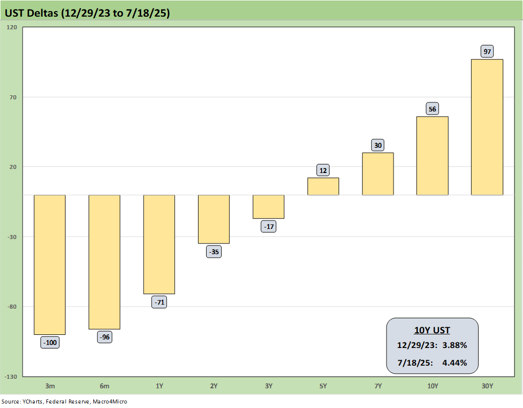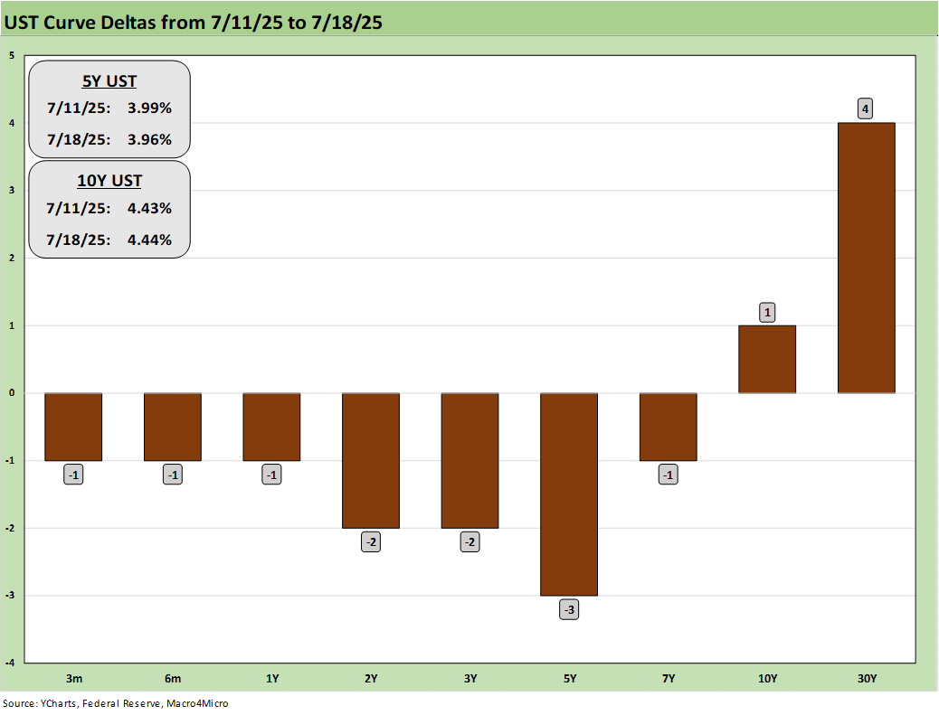 The 1-week US deltas above show a mild week for overall action with a bias lower that helped bond returns during the week (see Footnotes & Flashbacks: Asset Returns 7-20-25). The 30Y was swinging around with some intraday price moves linked to Powell termination threats that kept the 30Y a bit above or just below 5.0% across the week.