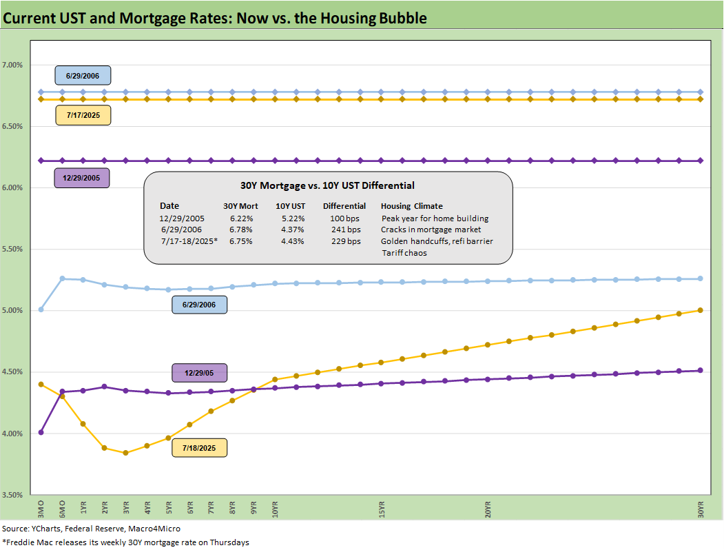 The stubborn 10Y UST has been a headwind for the housing markets (see Housing Starts June 2025: Single Family Slips, Multifamily Bounces 7-18-25, New Home Sales May 2025: Slip and Slide 6-25-25, Existing Homes Sales May 2025: Sequential Stronger, YoY Weaker 6-23-25). We got the weak June housing starts for single family last week and this coming week we will get the June Existing Home Sales and the June New Homes sales.