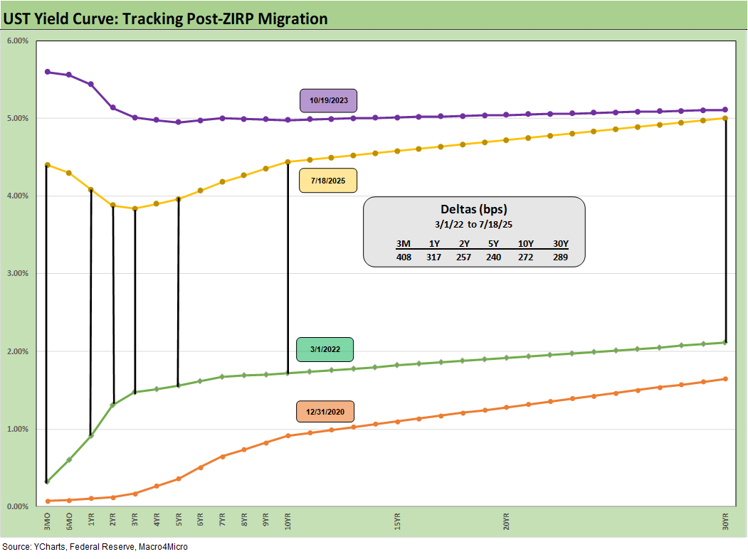 We wrap this week’s State of Yields with an update of the running UST deltas since March 1, 2022 just ahead of the end of ZIRP (effective 3-17-22). We include the 12-31-20 UST curve and 10-19-23 peak UST curve as frames of reference.