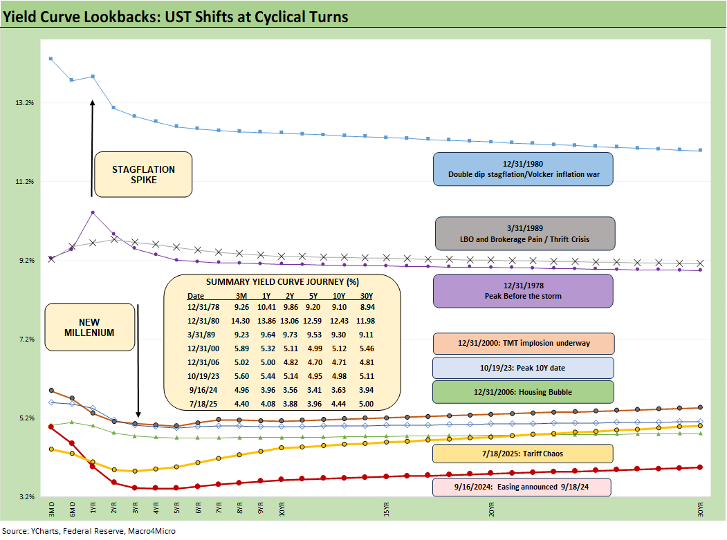 The above chart details the material move from the peak UST curve of 10-19-23 down into the UST bull rally of Nov-Dec 2023 and then eventually into the lows of Sept 2024. The Sept 2024 low tick only came after a bear steepener hit the curve through the summer of 2024. We then moved back into the bear steepener mode until the tariffs roiled the UST markets and initially sent 2Y to 30Y lower on cyclical fears.