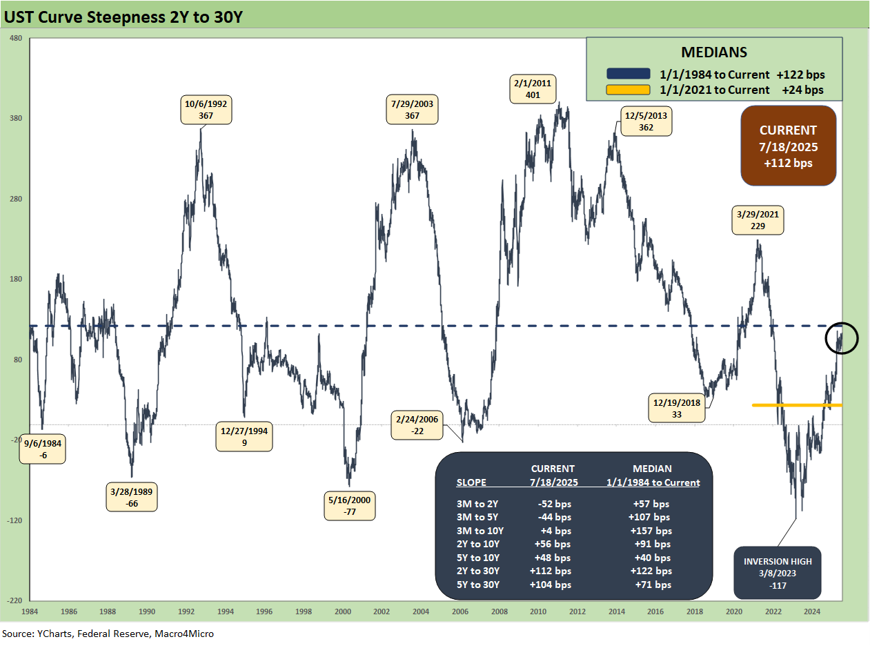 The 2Y to 30Y UST slope is now closing in on the longer-term median from 1984 with the current slope at +112 bps only 10 bps below the median of +122 bps. That is a long way from the -117 bps high on the 2Y-30Y inversion peak reached in March 2023.