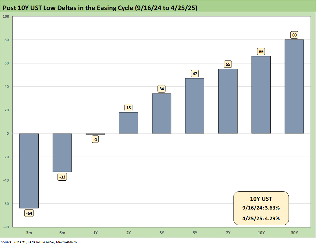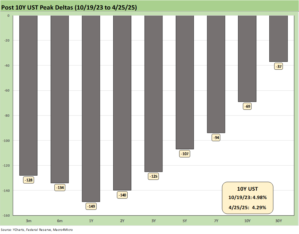 The above chart breaks out the running UST deltas since the peak date of the 10Y UST (10-19-23). Wiping out that 10Y UST delta of -69 bps since the peak in Oct 2023 would take some bad news on inflation or a more sustained erosion of confidence in the US macro picture (weak dollar, erosions of buyers, net sellers of UST, etc.). The weaker dollar is not helping any more than the record deficits and soaring interest bill and UST supply needs.