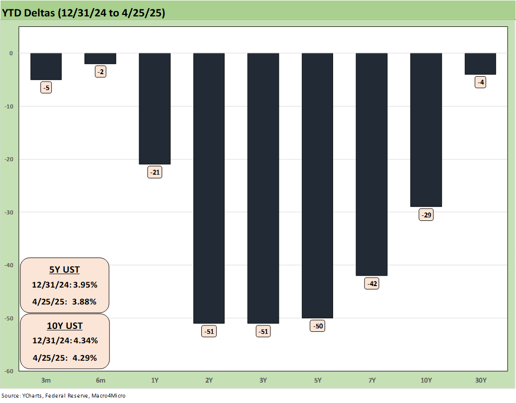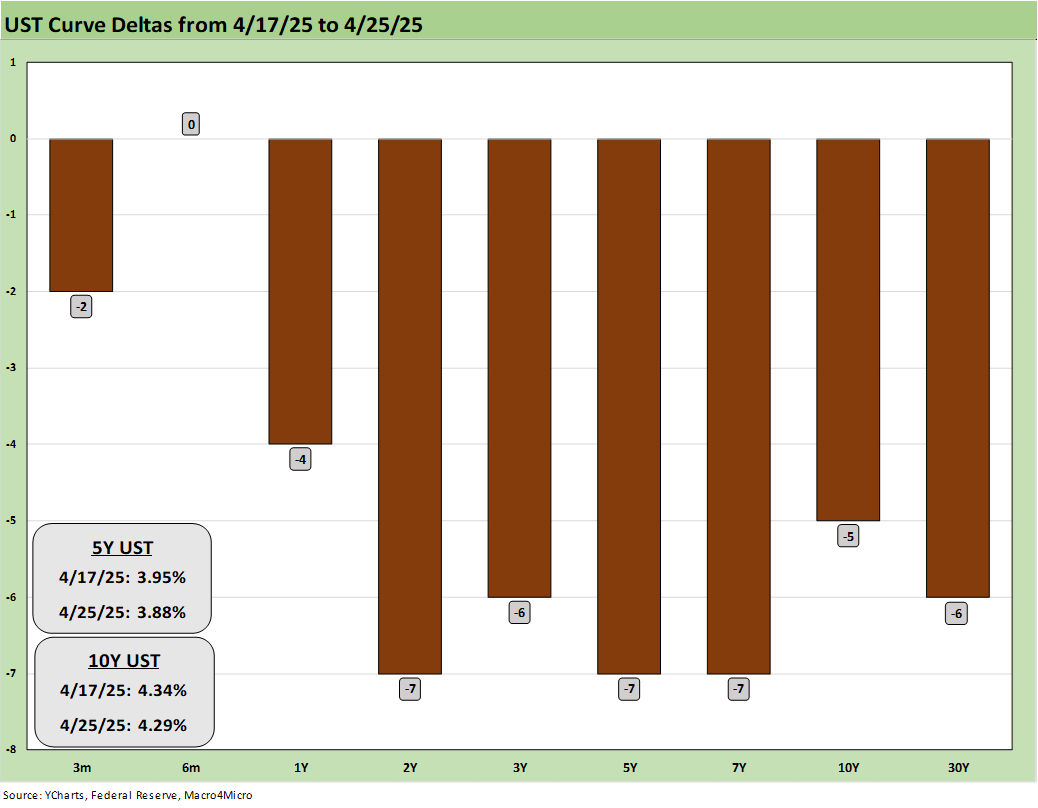 The UST curve posted a modest rally for the week with a very big macro release stretch ahead (PCE, 1Q25 GDP, JOLTS/payroll and more) while the earnings flood picks up with more Mag 7 and a rush of bellwethers including GM and UPS among cyclical indicators.