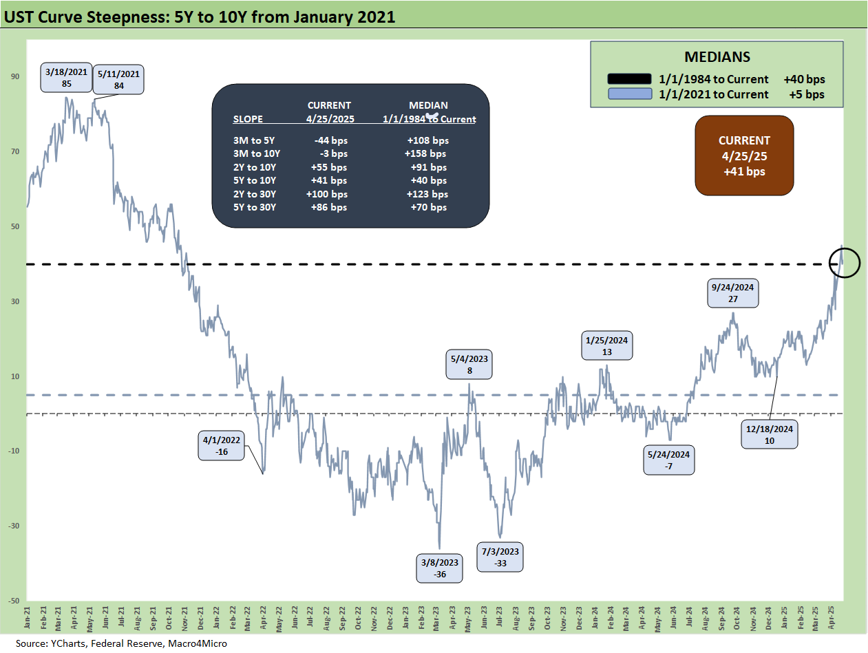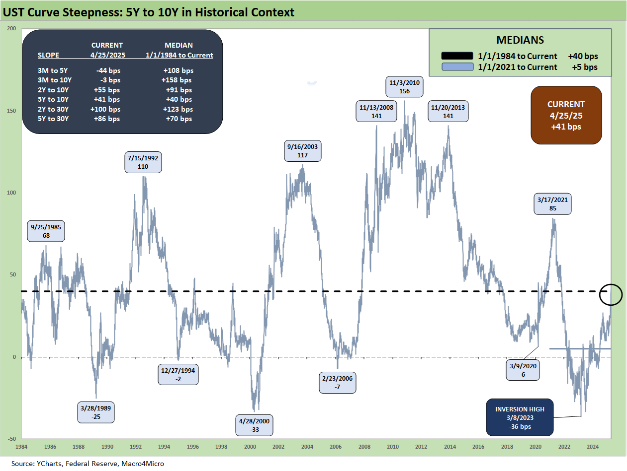 The above time series updates the 5Y-10Y UST slope since 1984. The upward slope of +41 bps is right in line with the long-term median of +40 bps. In other words, there is a rational term premium in the UST market from the mid to long end. We also see that in the 5Y to 30Y.