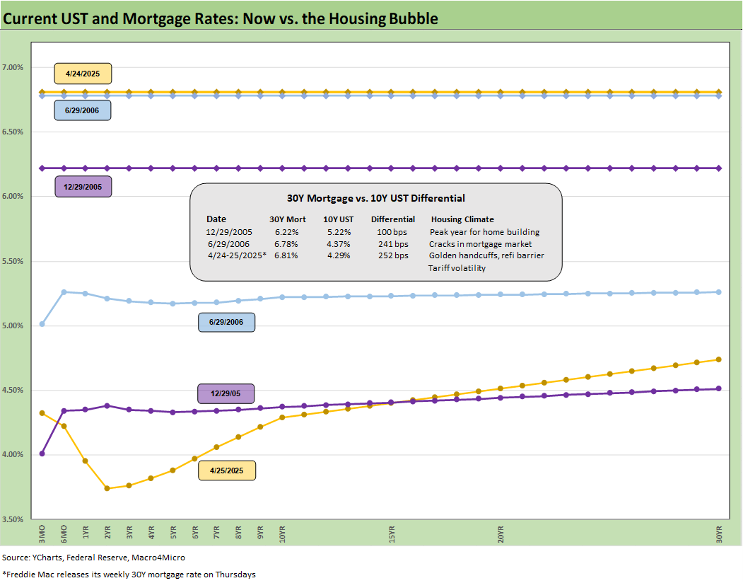 The above chart updates the UST curve for this past Friday and the Freddie Mac 30Y Mortgage benchmark rate (noon Thursday release). We include two useful historical periods including the peak homebuilder year end of 2005 and mid-2006 when RMBS quality concerns were catching headlines as the housing bubble was peaking. We post UST curves for each period in the chart. The past week was 6.81% for Freddie’s noon Thursday pricing.