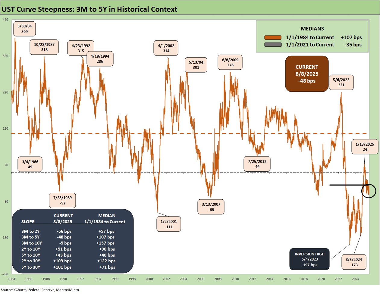 The challenge is still that front end inversion from 3M to 2Y and from 3M to 5Y. We look at the history of the 3M to 5Y later in this commentary. The inversion anomaly on the front end during a protracted expansion has been hard to shake with the FOMC holding the line over tariff-related inflation questions.