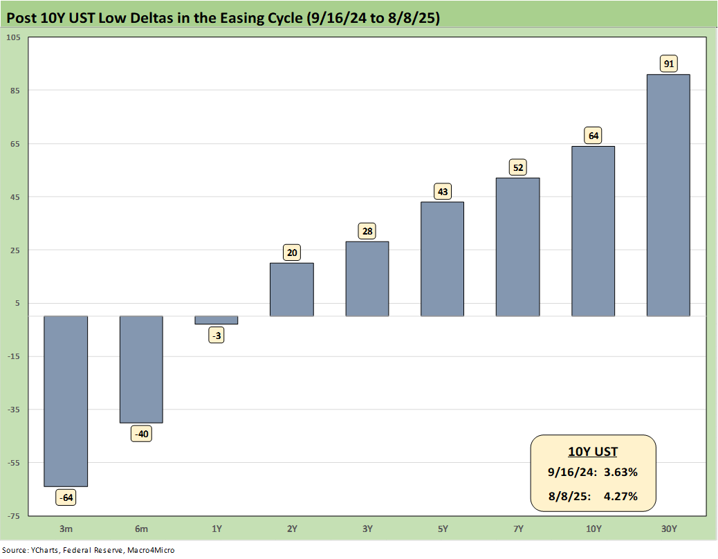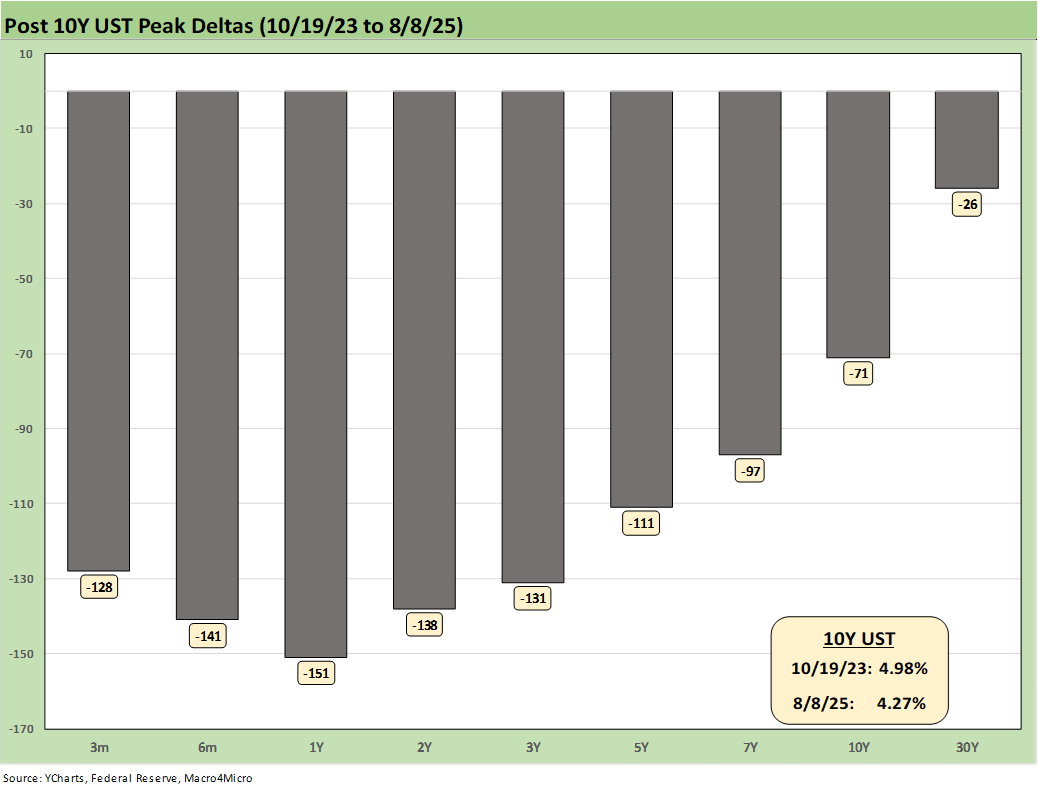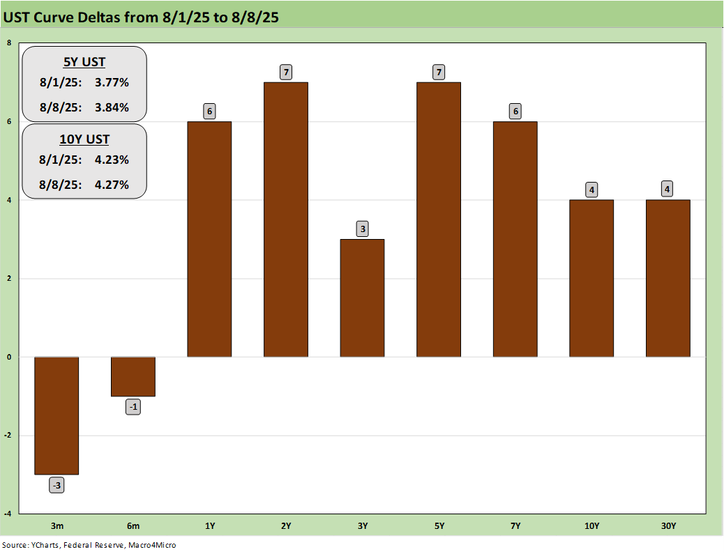The above chart updates the 1-week UST deltas with a modest upward shift from 1Y to 30Y that hit bond returns during the week (see Footnotes & Flashbacks: Asset Returns 8-10-25).