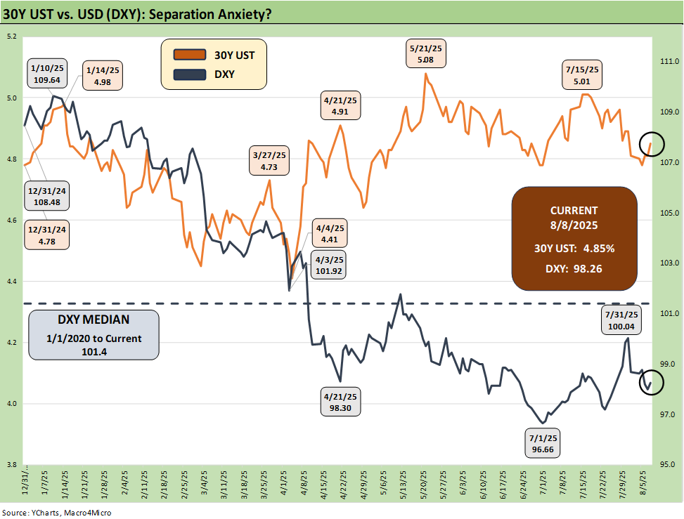 The 30Y was stubborn on the long end during the bull steepening period we had seen YTD, but last Friday’s payroll news and the BLS termination sent the 30Y lower by -11 bps that day. As detailed further below, the 30Y UST saw a modest rise again this past week.