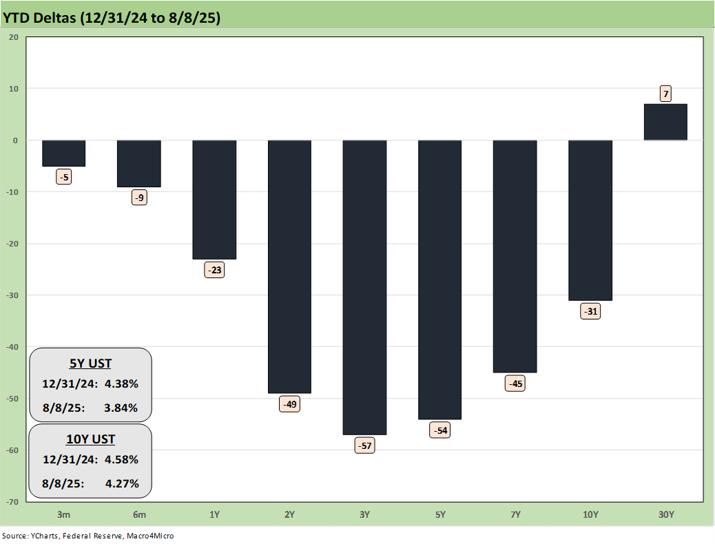 We update the YTD UST deltas above with the bull steepener supporting the bond market and returns of the various bond ETFs we track each week (see Footnotes & Flashbacks: Asset Returns 8-10-25).