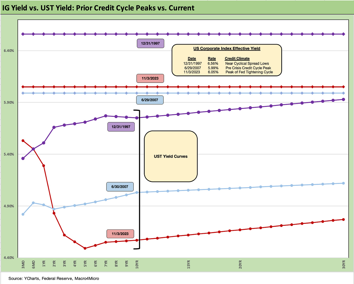 The above chart goes through a similar exercise for the current UST curve and IG index yield for current days vs. two periods where the market was at or near spread lows.