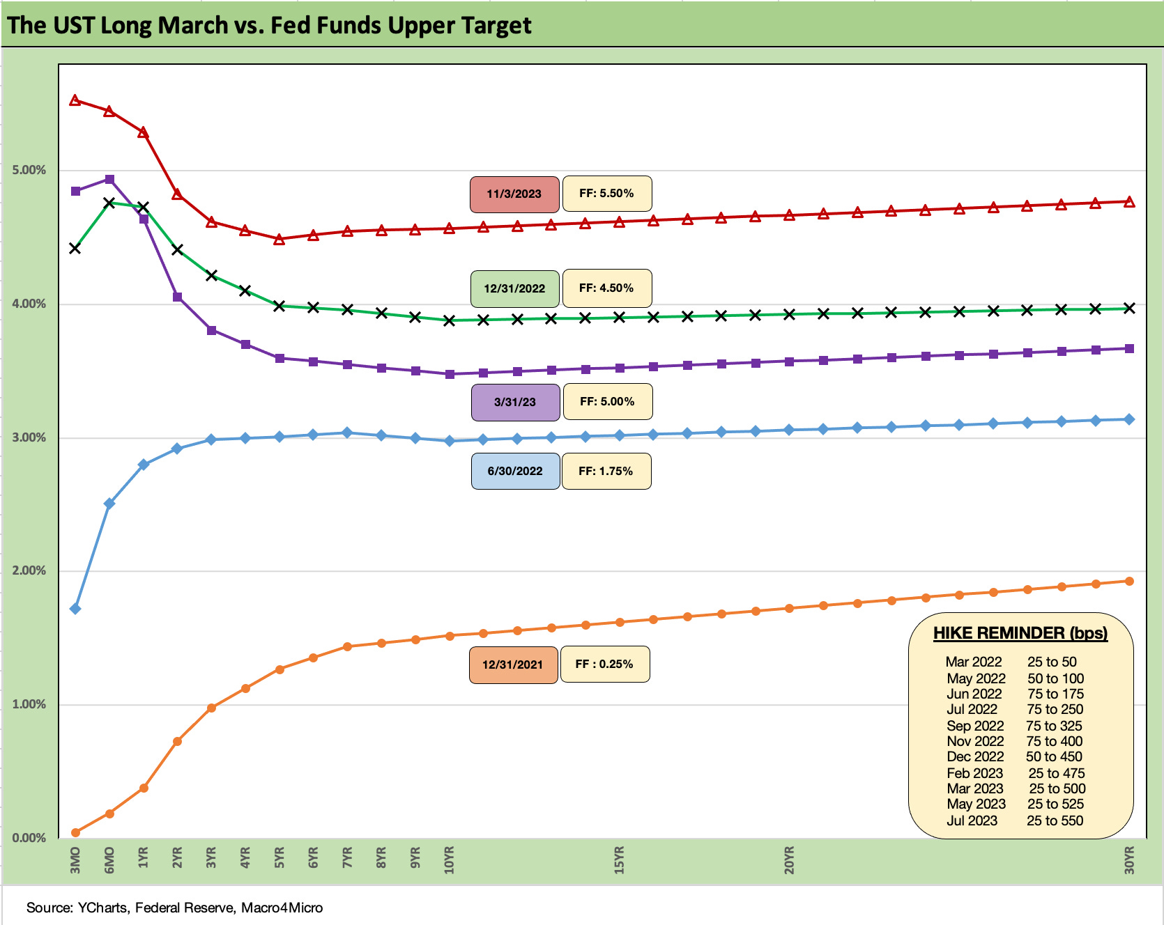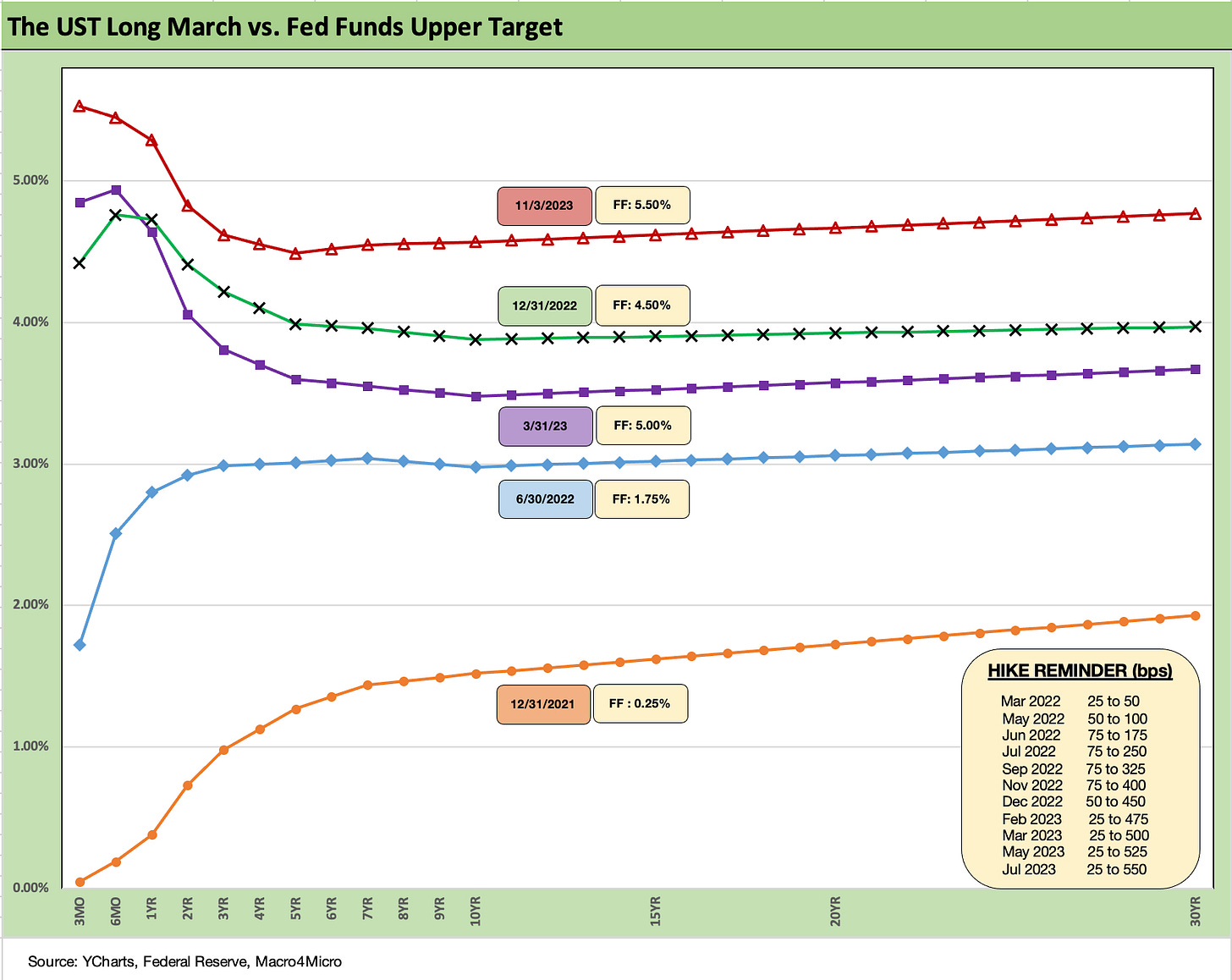 The above chart is somewhat of a buzzkill for those celebrating the UST bull flattener of the past week as we are still a very long way from even 1Q23 after the first post 4Q22 curve rally and downshift. To wind down the 1Q23 period, the curve saw a more pronounced inversion following the regional bank noise as the UST shifted lower and the Fed kept tightening.