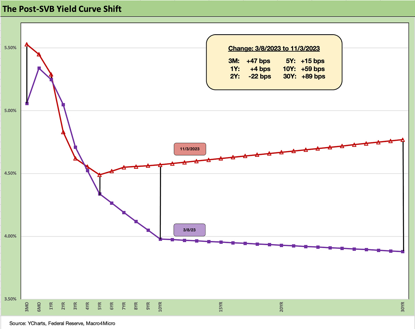 The above chart updates the post-SVB UST curve deltas. We start at 3-8-23 for the last clean trading day before SVB started to unravel and blew up on March 10 and was seized by Friday with the regional bank panic escalating. After this past week’s close, we see the 2Y UST lower along with the 3Y, but the rest of the curve from 5Y to 30Y shows a clear bear steepener.