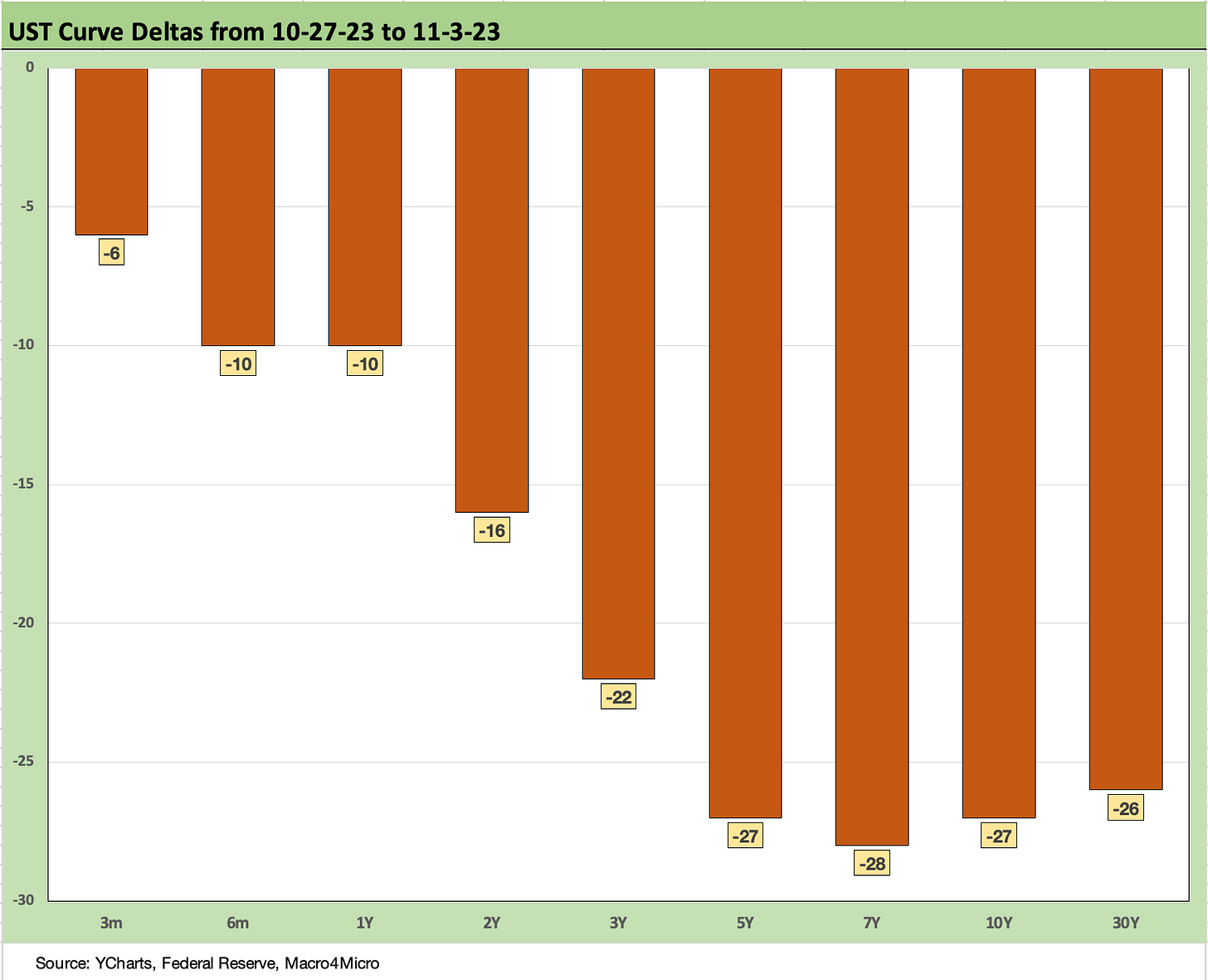 The above chart breaks out the UST deltas this past week, and there is not much mystery around what it meant for duration as the fixed income benchmarks rallied and turned in solid numbers. We look at the curve and tighter spread impact in the related Footnotes publication for asset returns (see Footnotes & Flashbacks: Asset Returns 11-5-23).