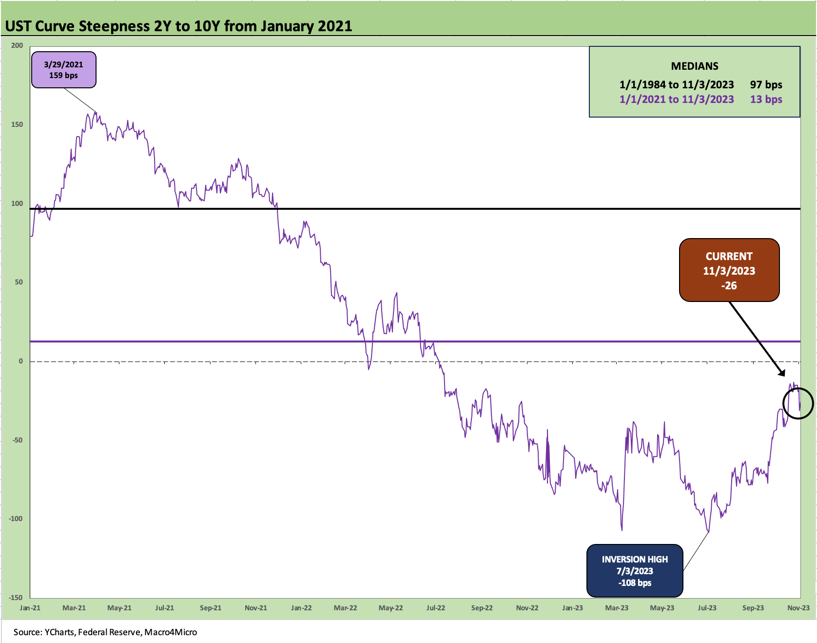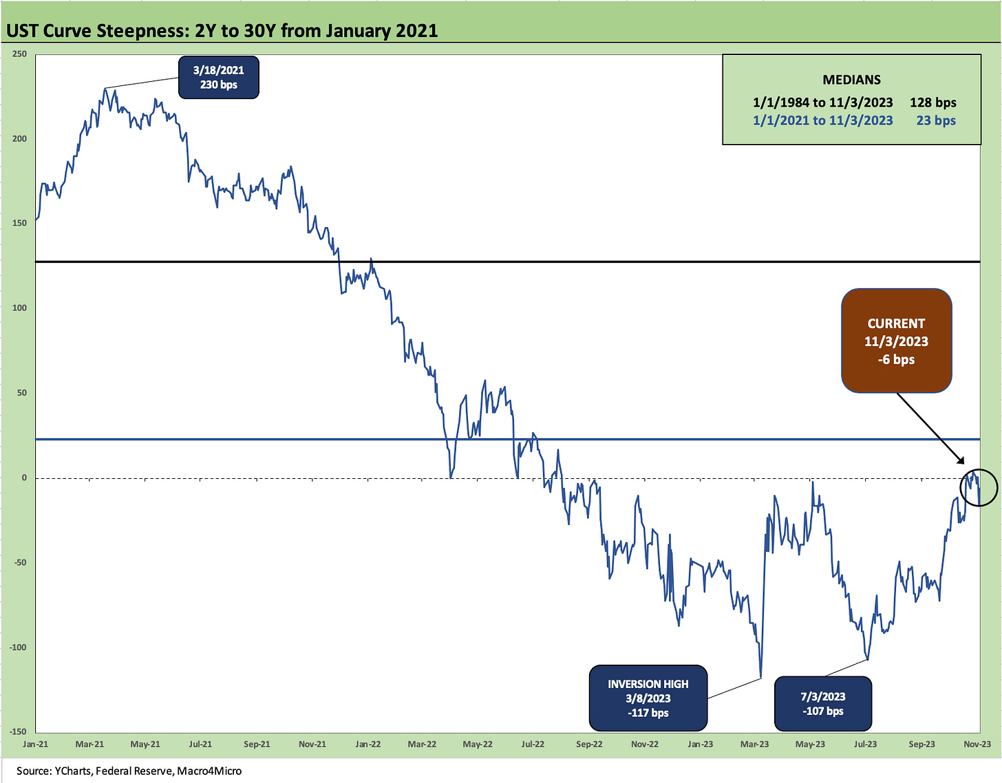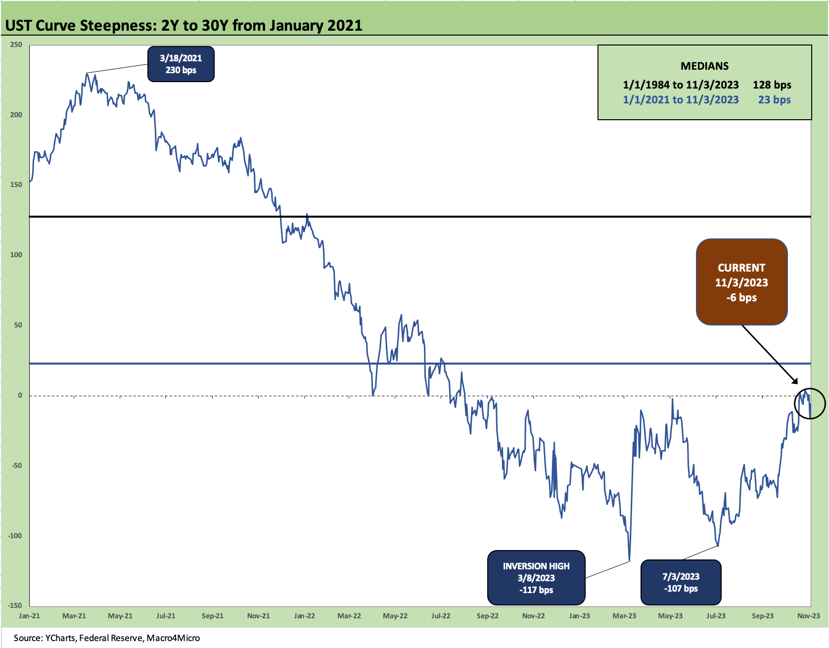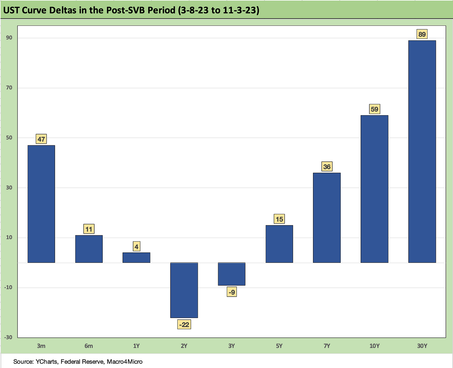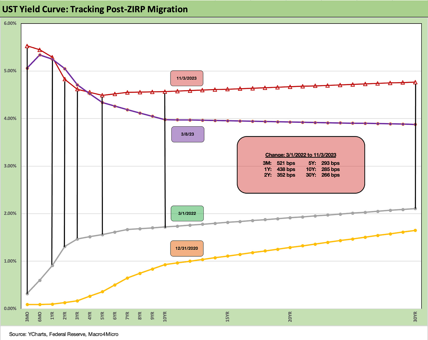 We wrap the commentary with our usual final chart that tracks the UST deltas from March 1, 2022, which was the month that ZIRP ended and the upward migration and monetary tightening cycle got underway. We also plot a year end 2020 UST curve as a frame of reference in the weeks after the vaccine came out. We list the UST delta across 3M, 1Y, 2Y, 5Y, 10Y and 30Y in what has generally been a bear inversion until the more recent bouts of steepening in some segments of the curve.