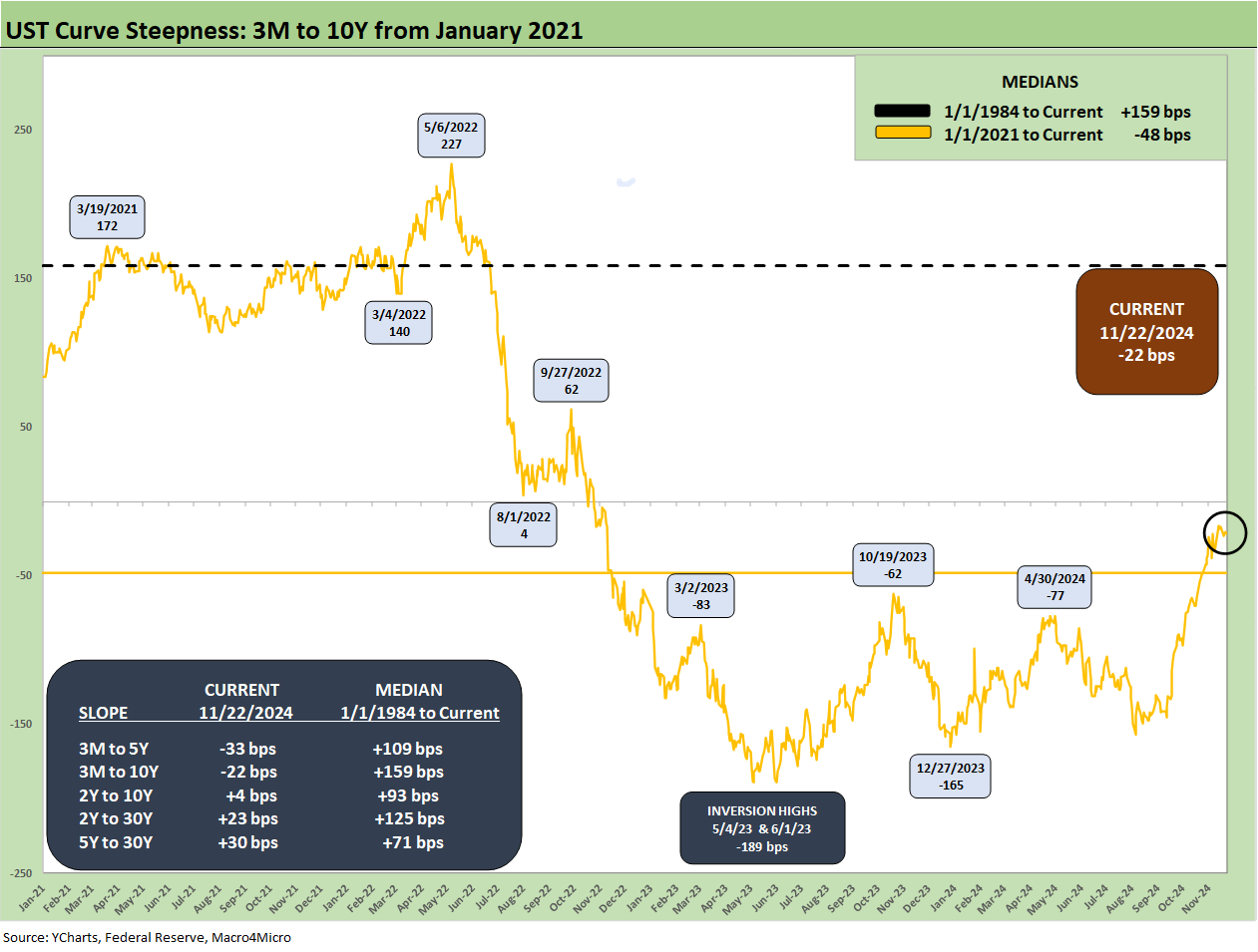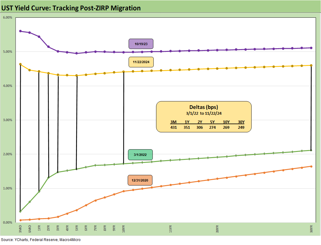 The above chart shows where the current UST curve is positioned across the tightening cycle. We also include the memory boxes on the tightening cycle timing and magnitude and now the easing cycle. The Friday 11-22-24 UST curve tops this chart and shows a modest upward slope from the 2Y UST area.