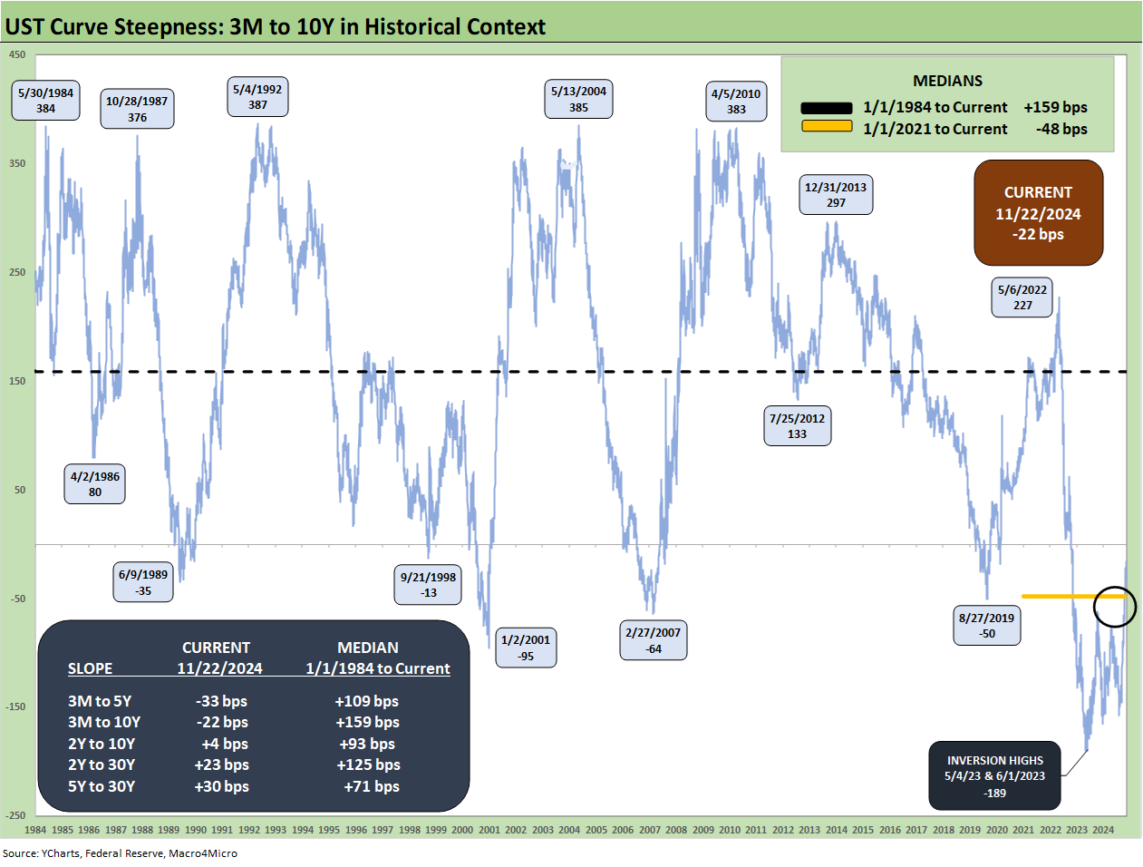 The above chart updates the 3M to 10Y UST slope across the cycles from 1984 and updates the other slopes we watch. The 3M to 10Y continues its migration toward flat with the current slope at -22 bps vs. a median of +159 bps but a long way from the peak inversions of -189 bps (5-4-23, 6-1-23).