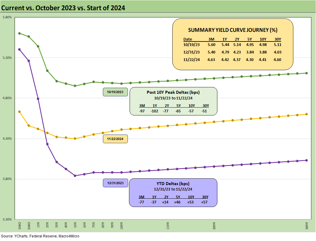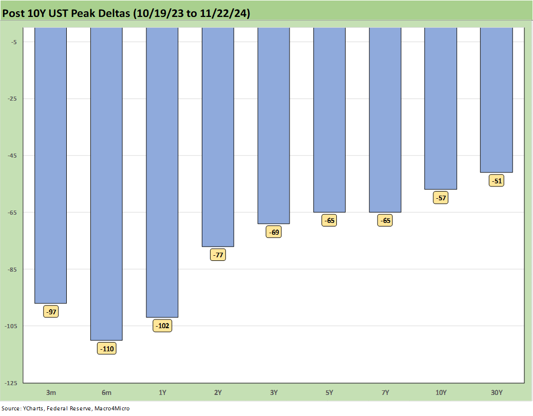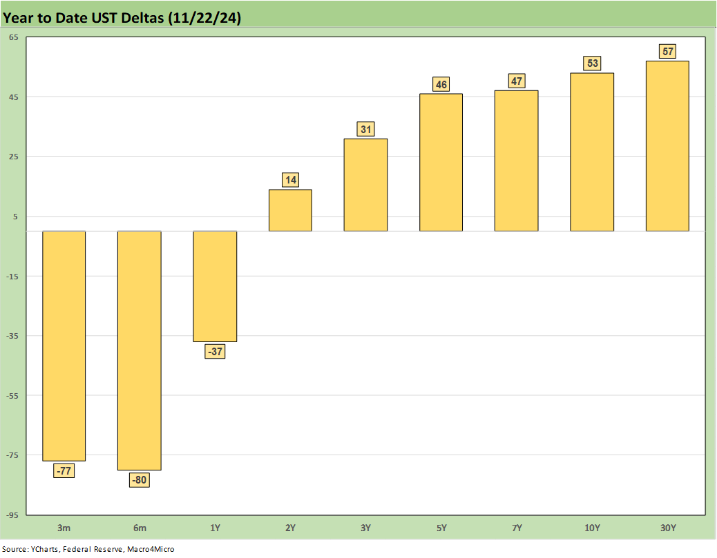 The above chart updates the UST deltas from the 10-19-23 peak date on the 10Y UST and from the 12-31-23 date for a running YTD metric. For 2024, we see the bear steepener from the 2Y UST out to 30Y even as the FOMC eased by -75 bps during the fall with another -25 bps still expected in Dec unless this week’s PCE numbers rattle the Fed.