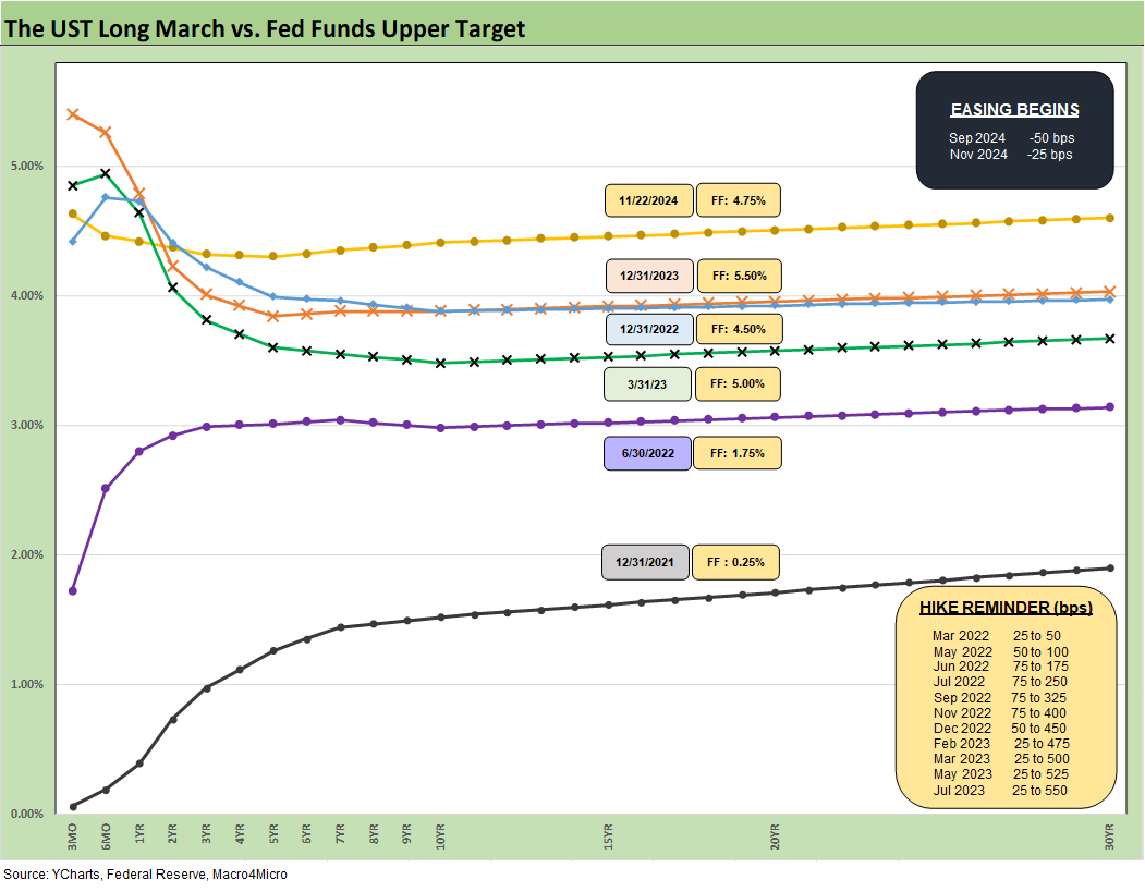 The 100 bps differential in fed funds between the 12-31-22 UST curve vs. the 12-31-23 curve still saw a convergence in the 10Y UST area between those two curve dates despite that tightening. When considering where the UST curve is today, we also could be looking at a 100 bps differential again by year end 2024 with the 10Y materially higher. The lack of movement in the 10Y last time is food for thought.