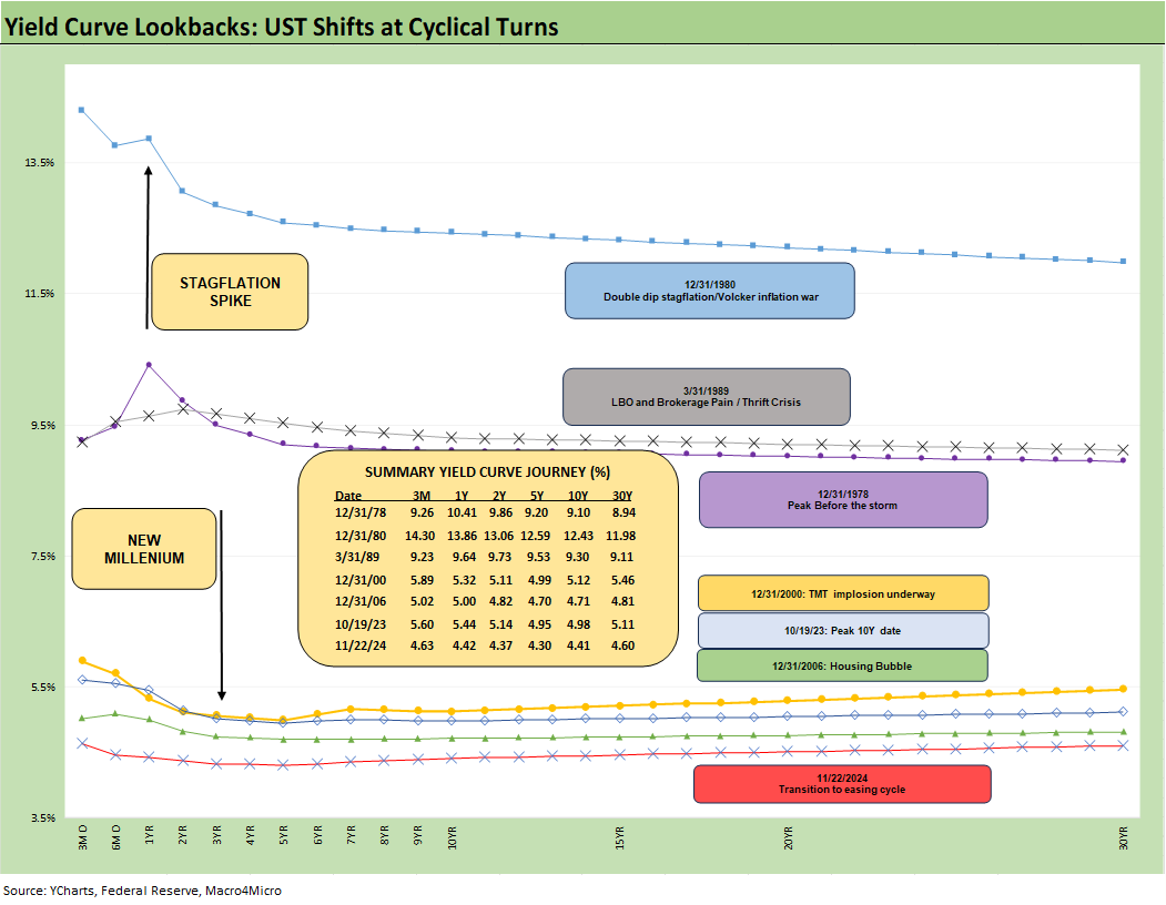 The yield curve history from the “Carter inversion of 1978” through this past Friday details the UST curve migrations across some key cyclical time periods before the credit crisis. We do not detail the post-crisis UST curves that were distorted by ZIRP, QE, and normalization periods and jump right to the 10-19-23 peak date in the 10Y UST.