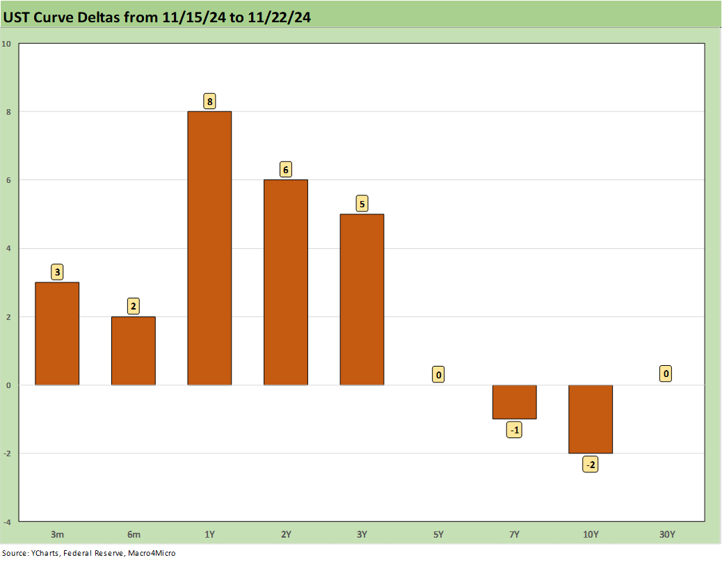 The above chart breaks out the weekly UST deltas with small (or zero) moves from 5Y to 30Y and adverse moves on the short end. As detailed in this week’s Footnotes publication on asset returns, bond ETF returns were mostly positive this week even if all 7 were in the bottom quartile of the 32 benchmarks and ETFs in a strong equity week (see Footnotes & Flashbacks: Asset Returns 11-24-24).